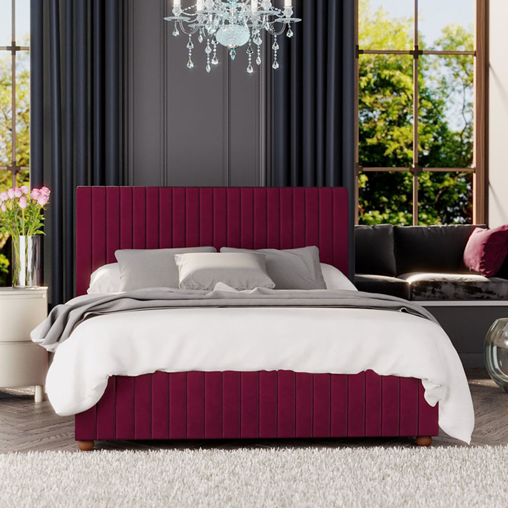 Make every night feel like a staycation with this Laurence Llewelyn Bowen Estella Double Berry Plush Velvet Fabric Ottoman Bed. Introduce contemporary glamour and British craftsmanship to your bedroom with this bed. This is a premium bed that exudes style and high-quality design and features a large storage area within the bed frame, making it a practical storage solution for modern homes. It has a headboard and a footboard with vertical scoring, and the headboard has been constructed with deep foam padding for extra comfort when reading or sitting up in bed. Handcrafted down to the last stitch, the bed has chunky upholstered panels to ensure lasting quality. The bed, finished with hand-turned and varnished hardwood feet, features quality sprung slats to improve mattress lifespan and comfort. For easy access to the storage area, the lift mechanism is supported with quality gas pistons. Once the bed is elevated, it will hold its position, allowing hands-free access. Additionally, the velvet bed has a dust protection sheet with a fabric base attached to the underside of the bed. UK mainland delivery only.