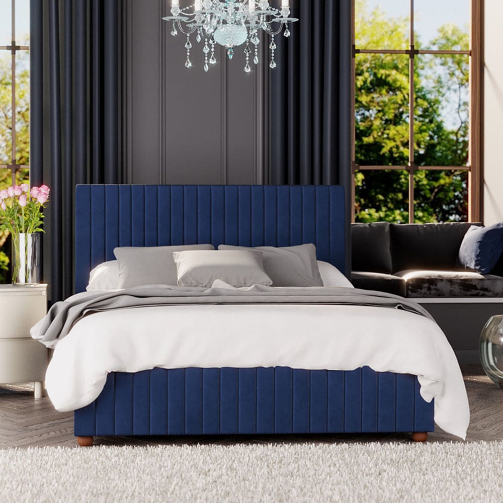 Make every night feel like a staycation with this Laurence Llewelyn Bowen Estella Small Double Navy Plush Velvet Fabric Ottoman Bed. Introduce contemporary glamour and British craftsmanship to your bedroom with this bed. This is a premium bed that exudes style and high-quality design and features a large storage area within the bed frame, making it a practical storage solution for modern homes. It has a headboard and a footboard with vertical scoring, and the headboard has been constructed with deep foam padding for extra comfort when reading or sitting up in bed. Handcrafted down to the last stitch, the bed has chunky upholstered panels to ensure lasting quality. The bed, finished with hand-turned and varnished hardwood feet, features quality sprung slats to improve mattress lifespan and comfort. For easy access to the storage area, the lift mechanism is supported with quality gas pistons. Once the bed is elevated, it will hold its position, allowing hands-free access. Additionally, the velvet bed has a dust protection sheet with a fabric base attached to the underside of the bed. UK mainland delivery only.