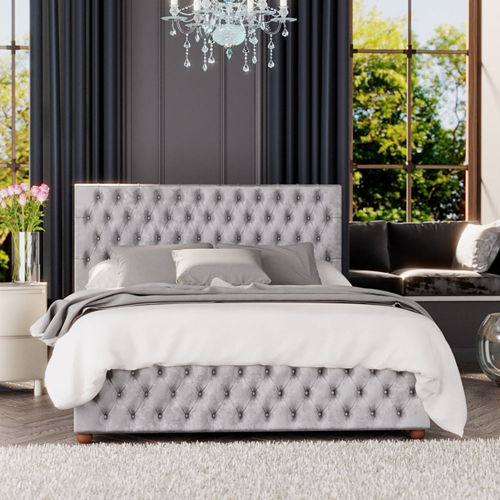 Make a luxurious and elegant addition to your bedrooms with this Laurence Llewelyn-Bowen Seren Silver Mirazzi Velvet Ottoman Bed. Handcrafted and upholstered, this bed collection marries skilled British craftsmanship with a classy appearance. The headboard and footboard feature a sophisticated Chesterfield scoring design, injecting your room with a glamorous, boutique hotel feel. Also, the headboard is made with deep foam padding for extra comfort while leaning against it. To ensure lasting quality, the bed is constructed with chunky upholstered panels and quality sprung slats that improve comfort and mattress lifespan. Functional and practical, this bed provides ample storage space within the bed frame. This storage space is easily accessible thanks to an easy lift mechanism which is supported with gas pistons to hold the bed's position for hands-free access. Bringing romanticism and stylish luxury to any bedroom, its opulent, velvet fabric finish is at the forefront of home interior design, providing your bedroom with modern glamour. Plus, its practical storage solutions ensure that you do not take up the extra floor space. Size: King Size. Please note: The bedding in the image is only for illustration purposes.