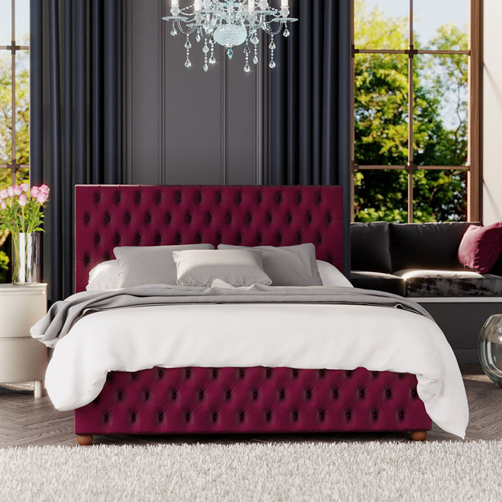 Experience the epitome of relaxation with this Laurence Llewelyn Bowen Seren Single Berry Plush Velvet Fabric Ottoman Bed. Introduce contemporary glamour and British craftsmanship to your bedroom with this bed. This is a premium bed that exudes style and high-quality design and features a large storage area within the bed frame, making it a practical storage solution for modern homes. It has a headboard and a footboard with vertical scoring, and the headboard has been constructed with deep foam padding for extra comfort when reading or sitting up in bed. Handcrafted down to the last stitch, the bed has chunky upholstered panels to ensure lasting quality. The bed, finished with hand-turned and varnished hardwood feet, features quality sprung slats to improve mattress lifespan and comfort. For easy access to the storage area, the lift mechanism is supported with quality gas pistons. Once the bed is elevated, it will hold its position, allowing hands-free access. Additionally, the velvet bed has a dust protection sheet with a fabric base attached to the underside of the bed. UK mainland delivery only.
