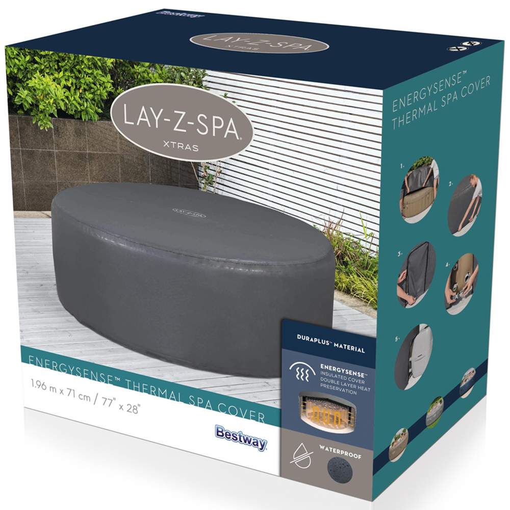 Enhance the energy efficiency of your inflatable hot tub with the Lay-Z Spa EnergySense Round Thermal Hot Tub Cover 195 x 71cm, which potentially reduces energy costs by up to 40%. This thermal cover features a double layer of insulation that helps the hot tub retain heat and allows water to heat up more quickly. Constructed from durable three-ply UV-resistant and water-repellent DuraPlus material, the cover is not only strong but also resistant to the elements. It boasts double-stitched seams for added strength and improved impermeability. The thick internal layer of insulating cotton and the anti-mildew-treated interior work together to minimize heat loss, while the safety lock clips and adjustable strap ensure a snug and secure fit, even in windy conditions. Additionally, the cover includes a zippered door designed for built-in pumps, and it can be easily removed to accommodate external pumps.