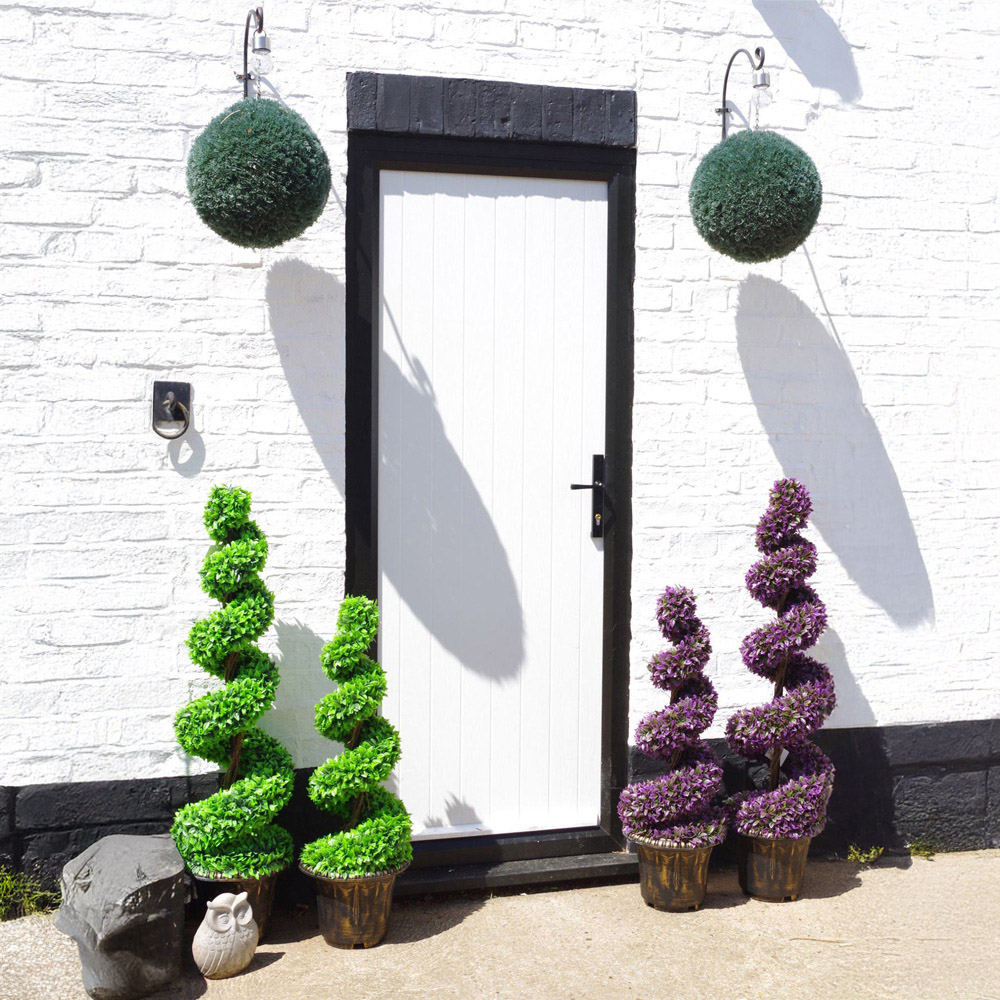 Price is for a pair of our 90cm Green Trees. Stunning realistic artificial boxwood spiral trees with special large leaves a very bold statement plant ideal for entrances. These come with the plastic decorative planters pictured and will be delivered to you fully assembled in a large box. Come with the decorative plastic planter shown all you need to do is un-box and it is ready for display immediately. You can also set these inside even larger outdoor planters if you wish (one of the photographs shows a customer's 120cm purple-coloured trees in her own larger pots outside her door - these are the same trees but slightly shorter and in green rather than purple). Twists around a central pole and natural vines. Special large format artificial leaves make this more visually striking than most artificial topiaries. Highly realistic, premium quality. These are suitable for indoor or outdoor use. If using an outside place in a sheltered area and protect from extremes of weather. Decorative planters (measuring 30cm wide x 23cm high) supplied is plastic although certainly doesn't look it (see our pictures). These are really attractive and complement the trees perfectly. The base of these is weighted and they are ready to display.