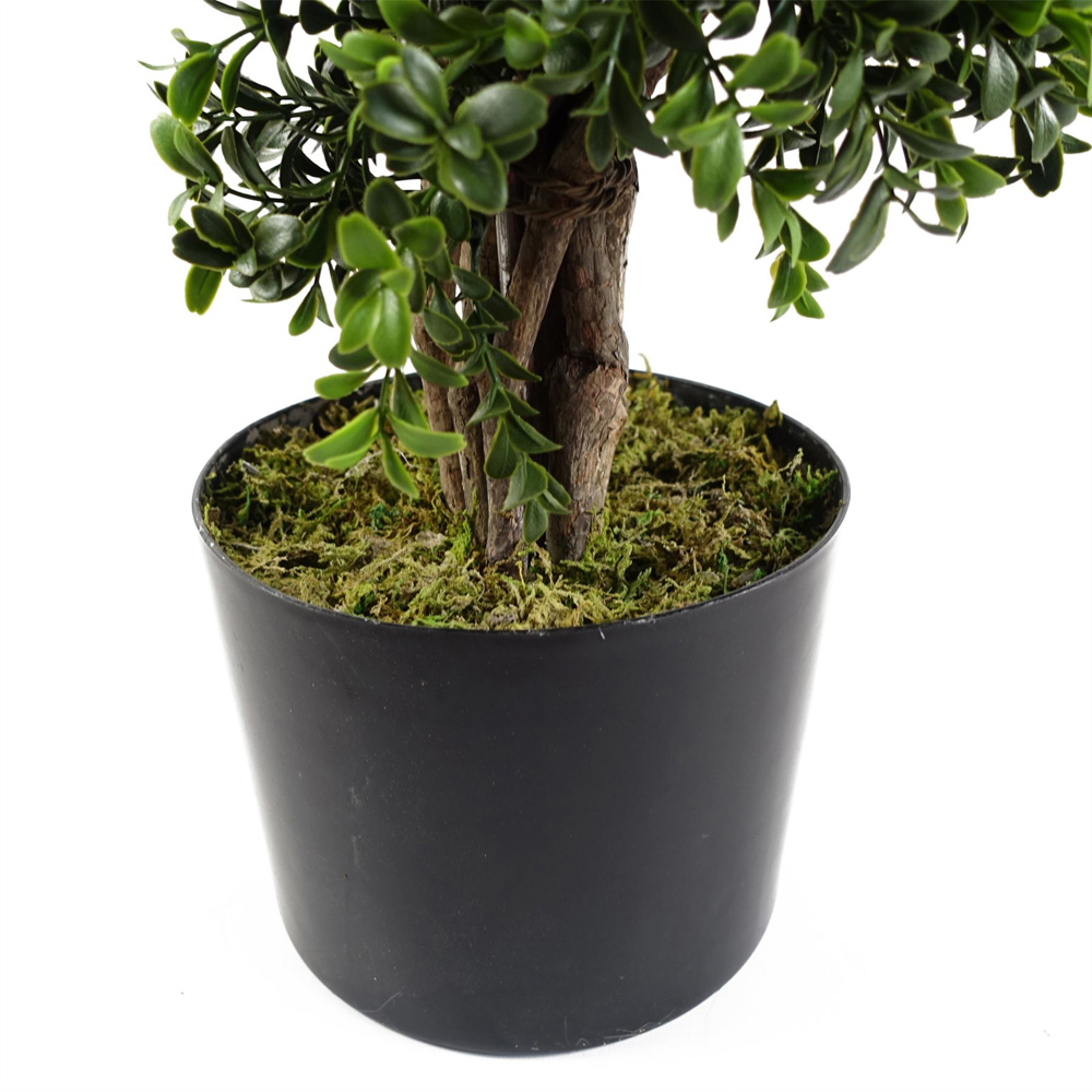 A highly realistic replica of the Spiral Buxus tree in a large 120cm size. This tree is UV-resistant and designed to be used outdoors. As we have it arranged in our photos this measures 120cm high x 40cm x 40cm. Fixed branches and require no arrangement. Plastic weighted pot measures: 18cm (d) x 14cm (h) approx. Potted in a plain plastic pot and is ready to display. You can make these trees look all the more impressive by popping them inside a larger planter and covering them with soil- bark or gravel to add to the realistic effect of Leaf Design UK products.
