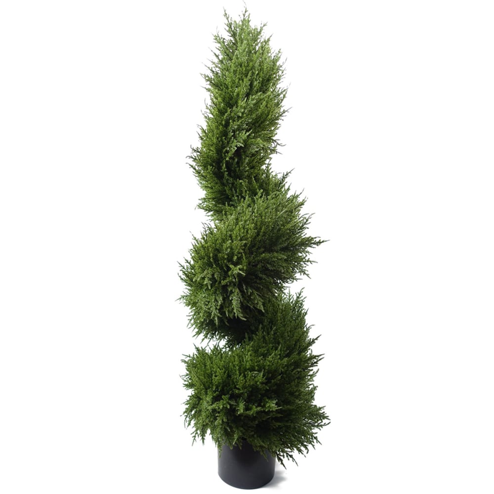 A highly realistic replica of a Spiral cedar cypress tree in a large 120cm size. This tree is UV-resistant and designed to be used outdoors. As we have it arranged in our photos this measures 120cm high x 40cm x 40cm. Fixed branches and require no arrangement. Plastic weighted pot measures: 18cm (d) x 14cm (h) approx. Potted in a plain plastic pot and is ready to display. You can make these trees look all the more impressive by popping them inside a larger planter and covering them with soil- bark or gravel to add to the realistic effect. Leaf Design UK product.