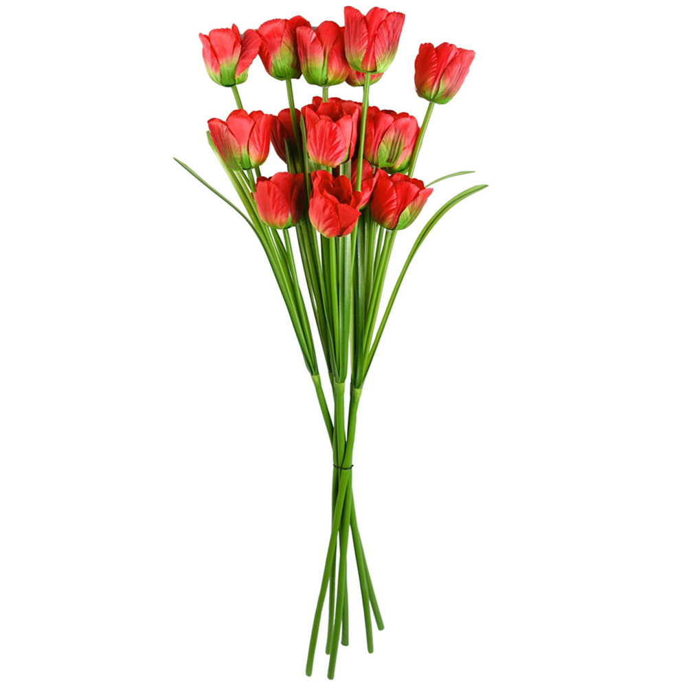 Pack of 6 x 80cm Artificial Tulip Red stems. Realistic 80cm artificial tulip flower stems, featuring three beautifully crafted flowers with silk petals and realistic plastic leaves. The fully wired design allows for easy shaping and arrangement, making it a versatile addition to any decor. These look particularly nice when combined with foliage to create a larger display. Some of our photos show vases to give an idea of size and possibilities for arrangement, but no vases or planters are included with this foliage.