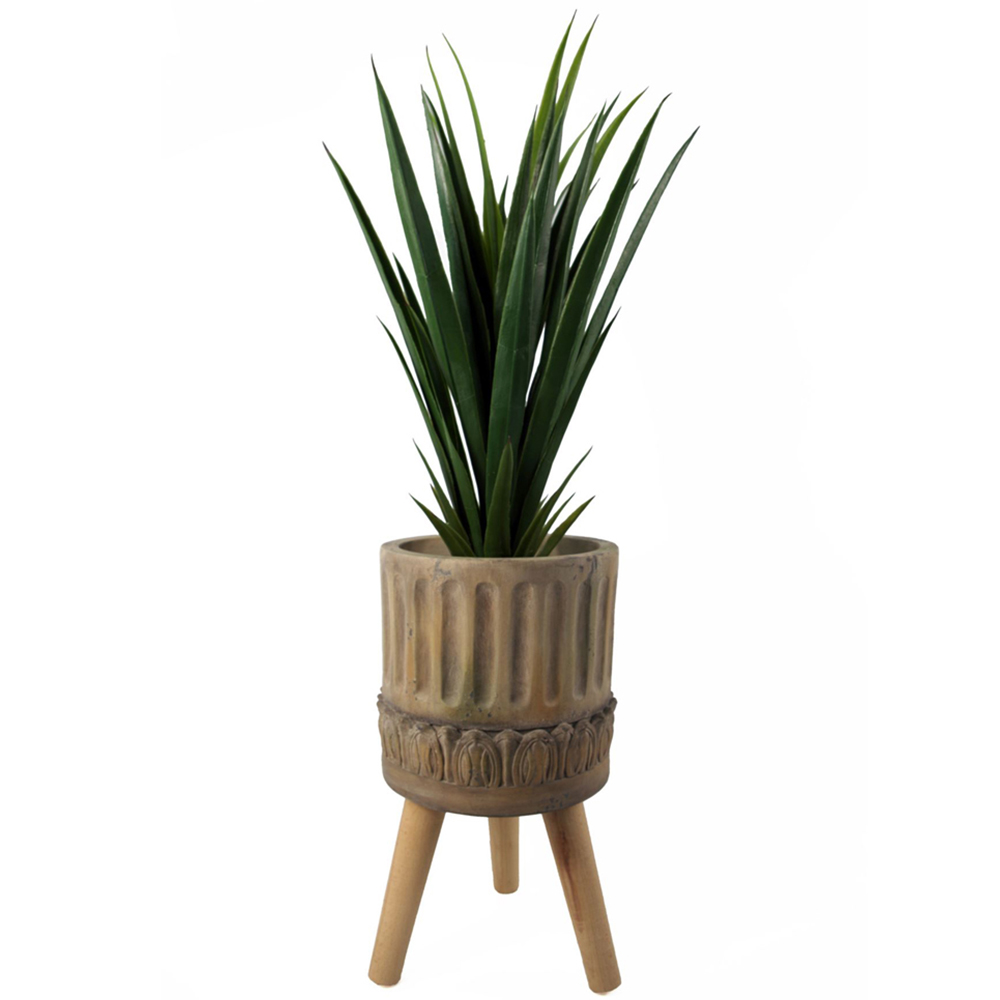 40cm x 21.5cm Zandi Roman fibreglass composite Planter. Large fibreglass composite planters, hand-finished in a rustic style. Large planter ideal for either artificial plants or real ones. Designed for indoor use but can be used outdoors in a sheltered position, we recommend protecting from extremes of weather. At the widest point, this pot measures 21.5cm. The top rim has a diameter of 21.5cm. The inner hole diameter is 18.5cm, any of the plants with starter pots smaller than this and all our bare stem plants will fit perfectly inside this planter. Legs measure 18cm. The top planter measures 22cm x 21.5cm. No drainage holes so suitable for watering indoor plants. Intentional Rustic finish. Comes requiring minor assembly by screwing on the legs - the legs are double threaded so by twisting the bolt in the opposite direction you can extend or reduce the length of the screw part that fits into the planter. Material: fibreglass composite. Legs: Wood. Overall size: 21.5 x 21.5 x 40cm.