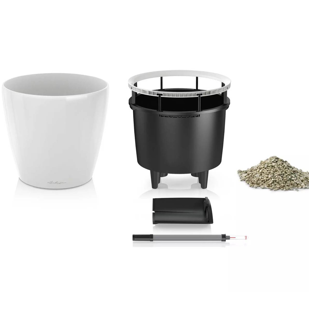 Add an elegant touch to your garden with the Lechuza Classico 43 LS Black Poly-Resin Self-watering Planter 40cm. This self-watering planter has been manufactured in Germany with durable plastic that is sturdy and long-lasting. The planter includes a reservoir and features a black glossy surface with a 40cm height. The Lechuza Planter can survive freezing temperatures and is fade-proof and impact-resistant, adding a contemporary finish to your space. It comes with a drain plug, an inner pot, an outer pot and an indicator. The sub-irrigation system provides the plants with sufficient water and fertilizers, keeping them full and happy. The drain plug drains excess water during rainy days, while the indicator keeps a check on the quantity of water in the reservoir. The intelligent planter provides plants with water and fertilizer for 2-12 weeks, depending on the planter size. Top water your plant for the first 10-12 weeks to help it adapt to its new self-watering home. After this period, you can fill the water tank below, and the plant will take the required water at times. The internal measurements of the planter are without the self-watering system. Please remember that this will occupy some space inside the unit, reducing your overall planting space.