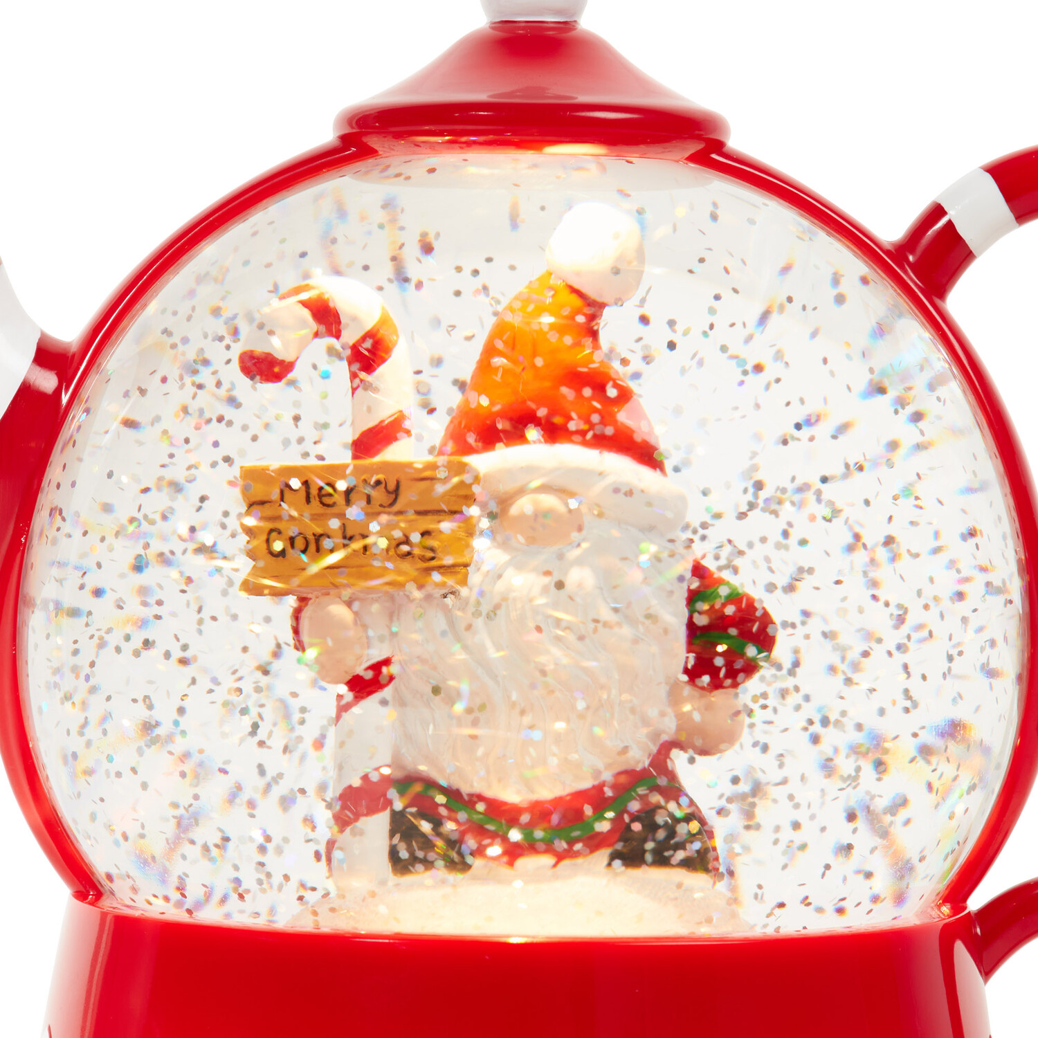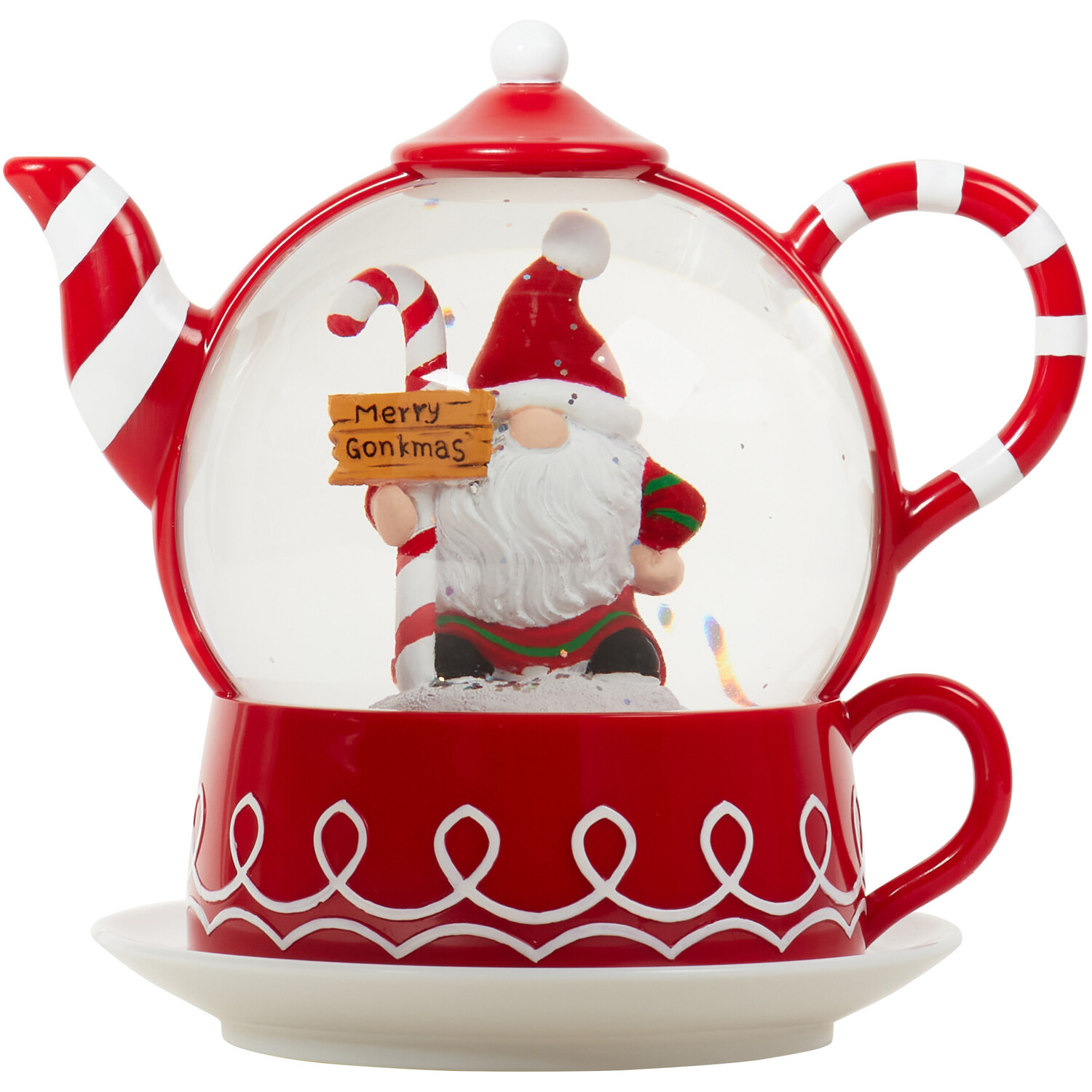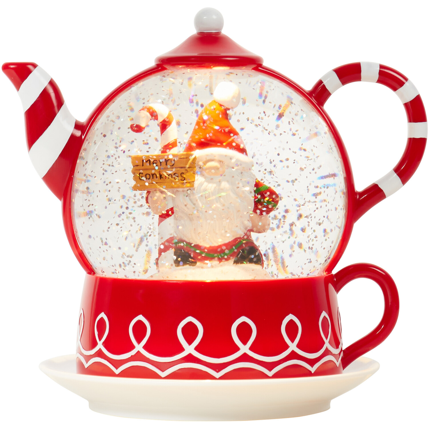 The LED Novelty Gonk Teapot is the perfect Christmas decoration for your space this winter. The festive ornament is crafted into a traditional teapot design and is finished with a Gonk inside with glitter and a warm white LED to create an inviting atmosphere in your space. It has a charming candy cane colour scheme and will look fantastic on display on accent tables, shelves, and mantelpieces throughout the Christmas season.