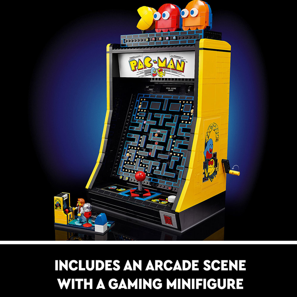 Take a trip back to the 1980s with this LEGO Icons PAC-MAN Arcade () building set for adults. Enjoy a rewarding project recreating the iconic maze-chase cabinet arcade game, considered by many as the most influential video game of all time. This replica is loaded with retro design details and fun features, including a four-way joystick and an illuminating coin slot. Turn the handle to activate a mechanical maze that simulates the classic chase between your favourite characters or open the back panel to view the mechanical elements. There’s even a 1980s arcade scene to build, complete with a gaming mini-figure and a display case with rotatable PAC-MAN, BLINKY and CLYDE figures. Suitable for ages 18 and above. Model no: 10323.
