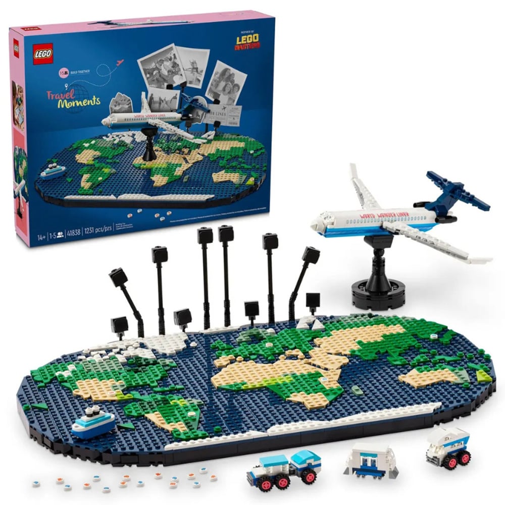 Build your imagination brick by brick with the LEGO 41838 Travel Moments. Get ready to create and display your travel memories with the Wonderliner jet and map building set. Families can reminisce about their favourite experiences or plan future adventures while constructing the jet and map. The map can be customised to showcase visited countries or upcoming trips, allowing for easy updates after each new journey. This set includes a jet, four micro-build vehicles, 20 location tiles, 10 photo holders, and five sets of instructions to assemble a world map in four sections, totalling 1,231 pieces.