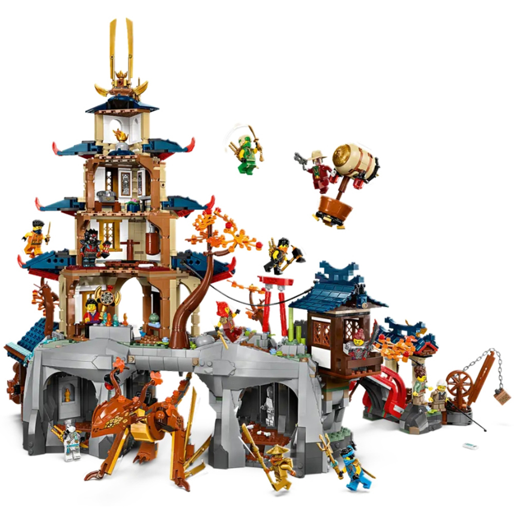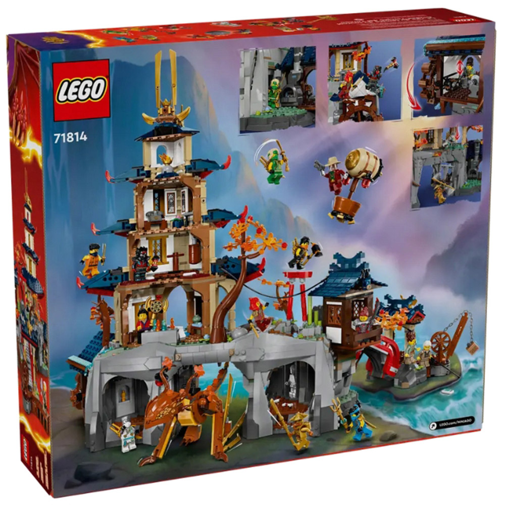 Build your imagination brick by brick with the LEGO 71814 Ninjago Tournament Temple City. The temple, nestled within a rugged rock formation, boasts a stunning four-tiered pagoda, a picturesque bridge, and a fully functional water mill that kids can operate to manoeuvre two battle platforms. Additionally, it features a blacksmith's hammer, hidden storage, a secret door, and an ingenious falling rocks mechanism activated by pressing a lantern. The temple can be rotated, offering an open back for added play opportunities and the ability to craft imaginative narratives. This captivating ninja playset includes 13 NINJAGO minifigures, an airship, and a poseable dragon with blade-style wings. With an impressive 3489 pieces, this adventure toy set from the NINJAGO Dragons Rising TV show season 2 is suitable for boys and girls aged 14 years and above to construct, enjoy, and proudly showcase as the Tournament Temple City.