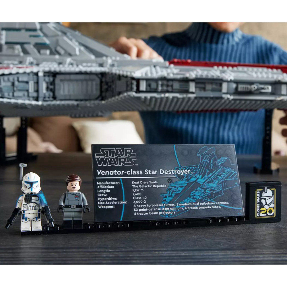 Upgrade your toy collection with the LEGO Star Wars Venator-Class Republic Attack Cruiser Building Kit. This kit enhances creative skills and imagination, which makes it a great gifting option for enthusiasts and collector friends. This cruiser, measuring over 109cm, will make a showstopping centrepiece in any room. It has a built-in display stand and an information plaque with a special Clone Wars 20th anniversary brick. It also has space for the two included LEGO Star Wars minifigures of Captain Rex and Admiral Yularen. This kit includes illustrated instructions in the box and on the LEGO Builder app to guide you through every step of this complex, immersive and rewarding build.