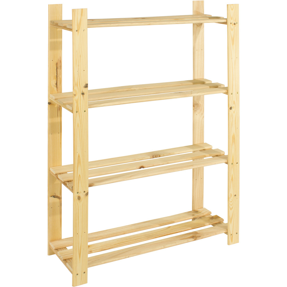 This Leighton Natural Wood 4 Shelf Slatted Storage Unit is ideal for use in the home or garage to store away clothes, books, tools, paints, and any household goods to give you the space needed to keep your home tidy. It's made from responsibly sourced pine timber, which gives it a natural look. All the pine slats have rounded outer edges, which are smoothly sanded and make it ready to paint or stain any colour or leave in its natural timber form. The storage unit uprights have a cutout check where you insert the shelves for assembly. The unit comes complete with all screws needed to make assembly easy. Despite its size, the storage unit is sturdy and capable of supporting up to 3kg per shelf. Its versatile design allows it to complement any interior decor and maximise space in the home while taking up minimal floor area.