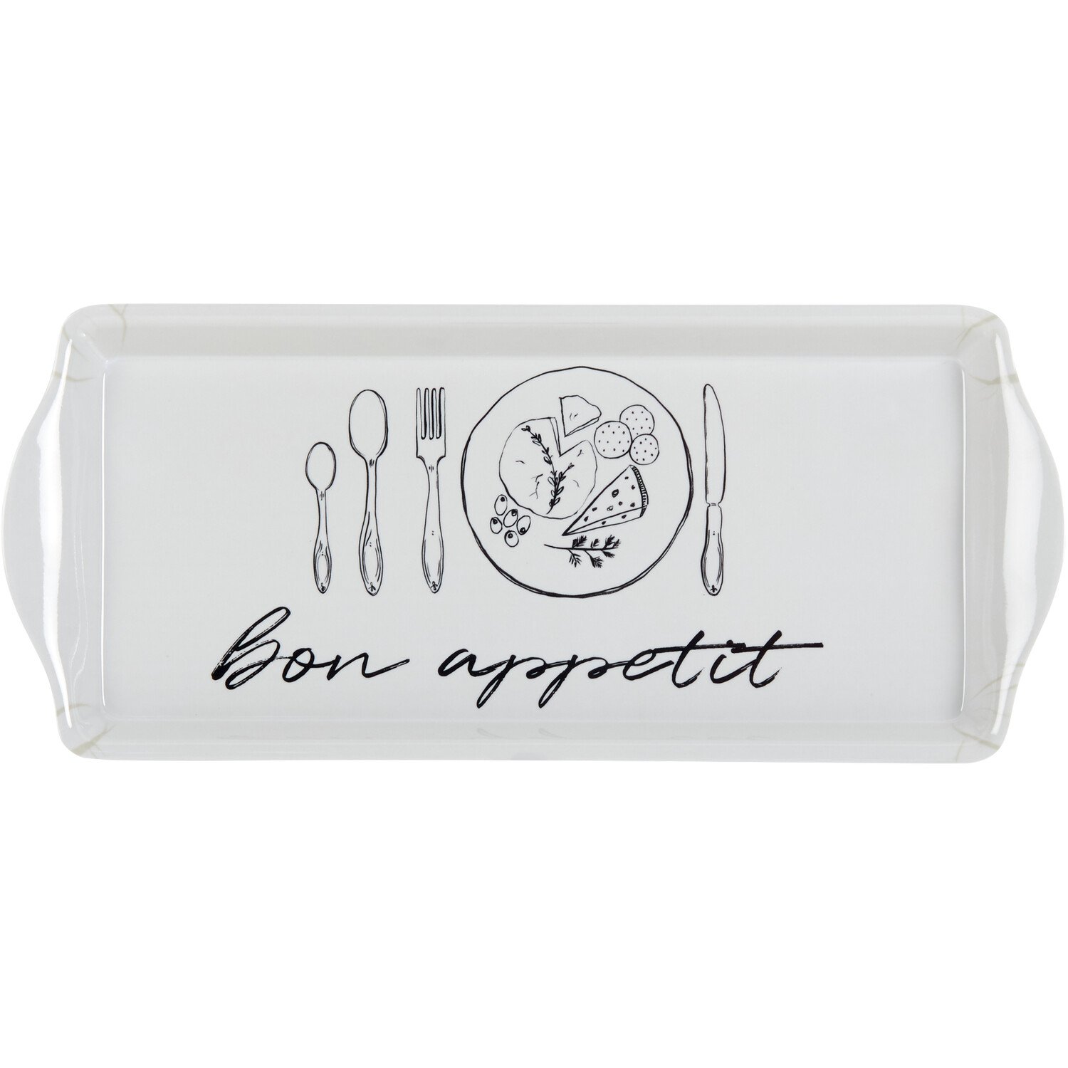 This Lets Eat Tray is a chic and charming home accessory for any occasion. This tray features a whimsical painterly still-life scene in black and white for a bold look. Excellent for serving drinks or bowls of snacks and is a delightful addition to your kitchen counter or coffee table.