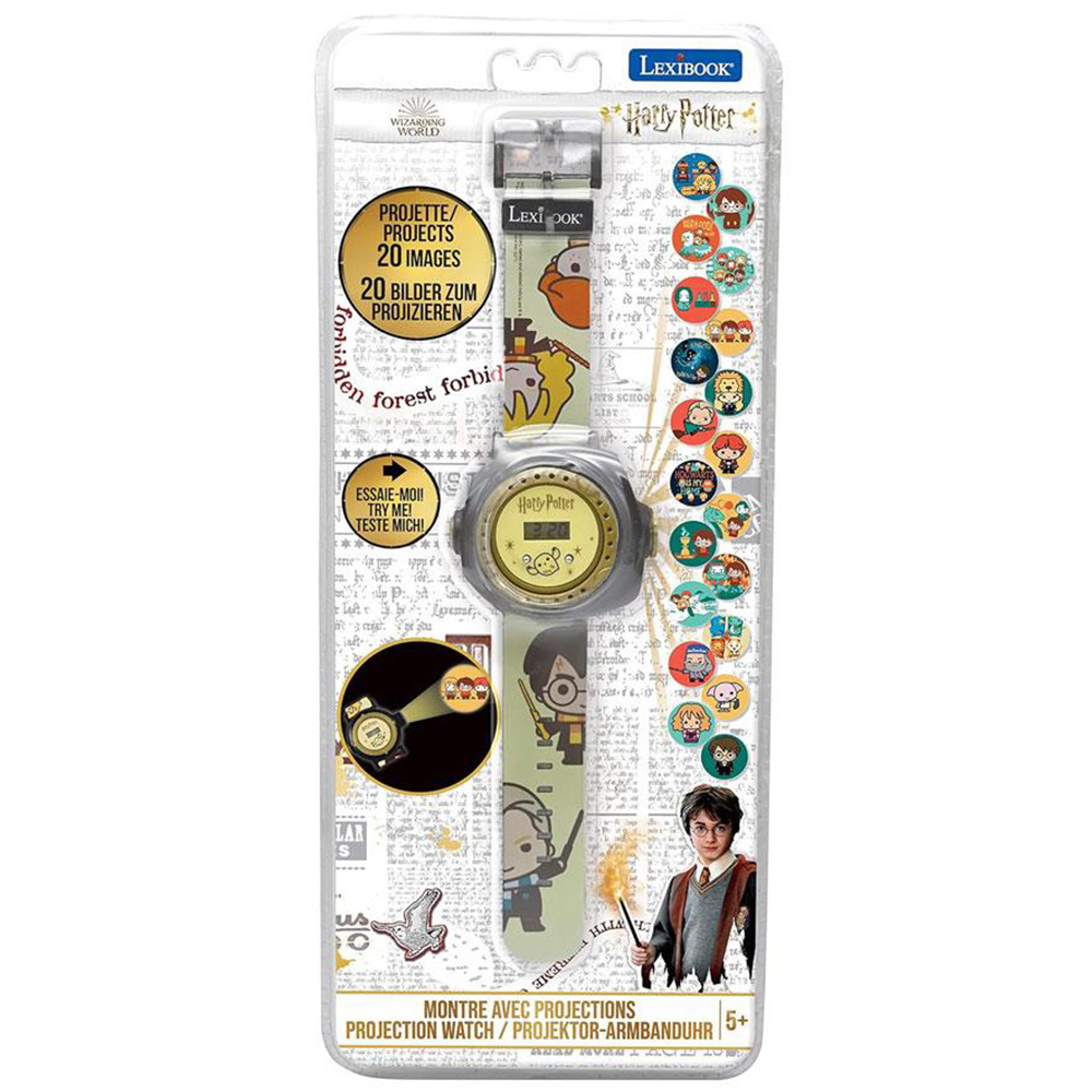 Amplify fun and play among young minds with the Lexibook Harry Potter Children Projection Watch. The children's projection watch is a fun and interactive gadget that comes with 20 different images to project onto any surface. This watch lets children communicate with their friends by sending coded messages using the projected images. It features an adjustable bracelet to fit small wrists and a movable ring for projecting images. The power supply consists of 5 x AG3/LR41 batteries, which are included with the watch.