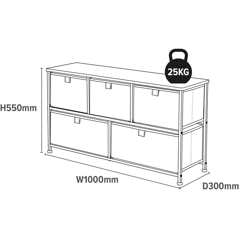 This Space Kids Storage Chest from Liberty House Toys is great for organising toys, clothes and other bedroom or playroom accessories. It has five removable drawers in two sizes, each offering generous storage capacity. The firm extra board base is supplied for the bottom of each drawer – providing extra strength and stability. Drawers are supplied in grey colour with three space themes and two polka dot designs. The drawers simply slide into place, and each shelf has a backstop to prevent drawers from sliding out. The drawer storage chest is a stylish and attractive design which will fit into small spaces but still provide ample storage space. In addition, the wooden top, with rounded edges for safety, can be used to place pictures, books, lamps, toys, and anything else you might want to display. It's an ideal and attractive storage solution for nurseries, bedrooms, or playrooms. The drawers are manufactured from breathable, non-woven, and soft fabric, while the white wooden top is made from hard-wearing MDF. Its patented frame is manufactured from sturdy white steel and comes with plastic feet to protect floors from scratching. The feet are height adjustable, so uneven floors are not an issue. Plus, it comes with wall fixtures, so you can safely secure the unit to the wall.