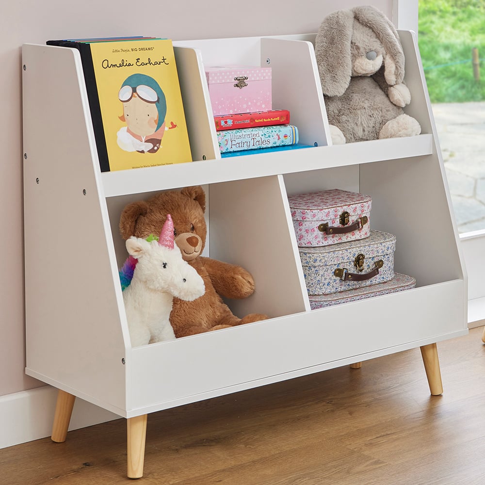 Brighten up your little one’s bedroom or playroom with the Liberty House Toys 5 Shelf Kids Sloping Bookcase. By incorporating this bookcase, you’ll help create an organised room that will be a great space for your child. It includes three compartments on the top and two on the bottom, providing enough storage space for your children’s favourite books and toys. It also has rounded edges for safety, with tapered wood legs and wall fixing for added stability. Featuring sturdy and long-lasting wood construction, this unit will be a great all-rounder in the bedroom or playroom. Supplied with wall fixings for safety. Suitable for ages 1 to 12.