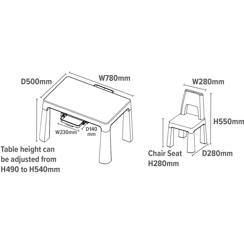 Unleash the full potential of your little one with the Liberty House Toys' Kids Height Adjustable Table and Chairs. This Grey and White set is for children ages 18 months to 8 years old and is made to grow with your child. It gives every place a dash of elegance with its streamlined and contemporary design. It readily adapts to your child's evolving needs because of its adjustable height feature (490-540mm). Attach the included height adjustment fittings without using any tools, then watch it change! Because we place the highest priority on safety, we have added anti-slip pads to the table and chairs. It is also portable and lightweight, making it ideal for usage both inside and outside. The table has built-in drawers on both sides that you can use at your pleasure. Chair Dimensions: H550 x W280 x D280mm, Chair Seat Height 280mm, Storage Drawer Dimensions: W230mm x D140mm.