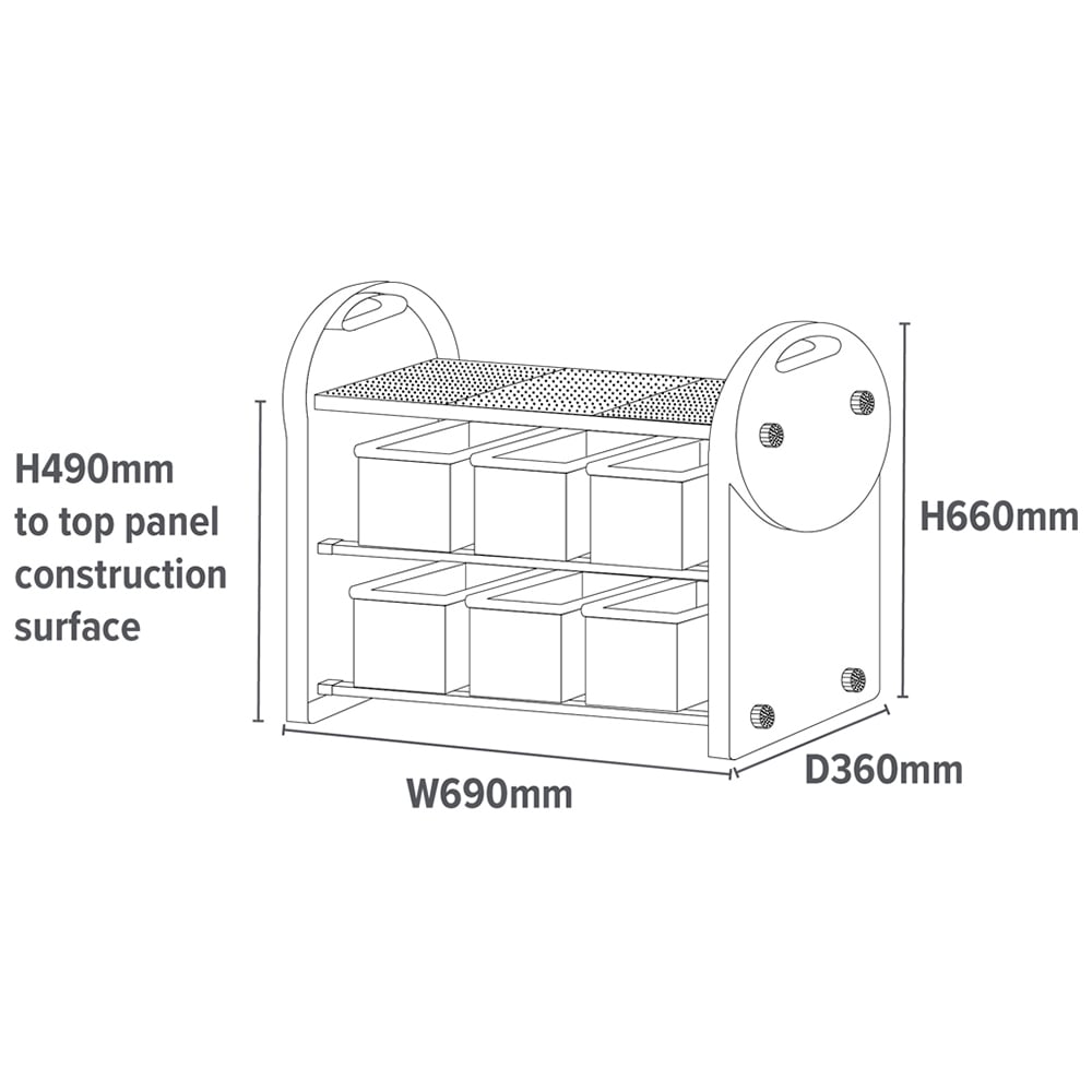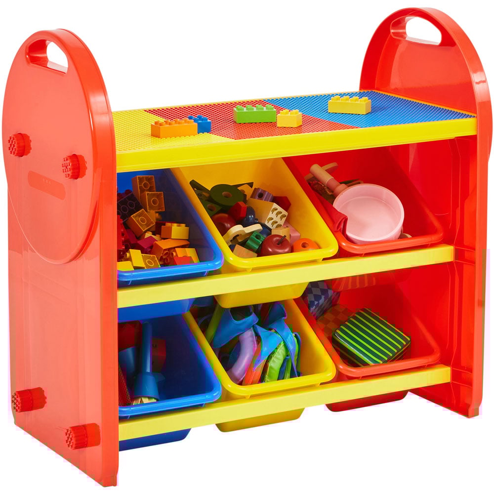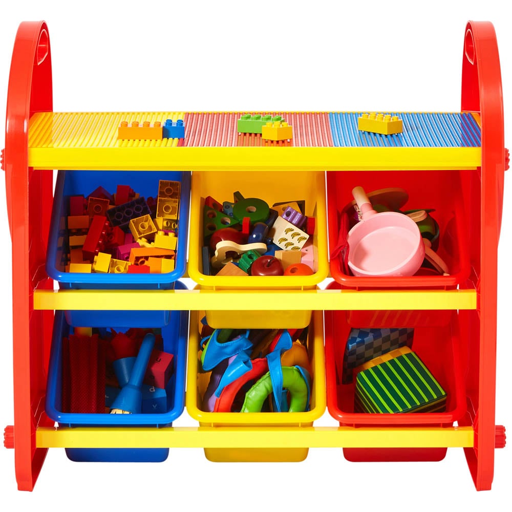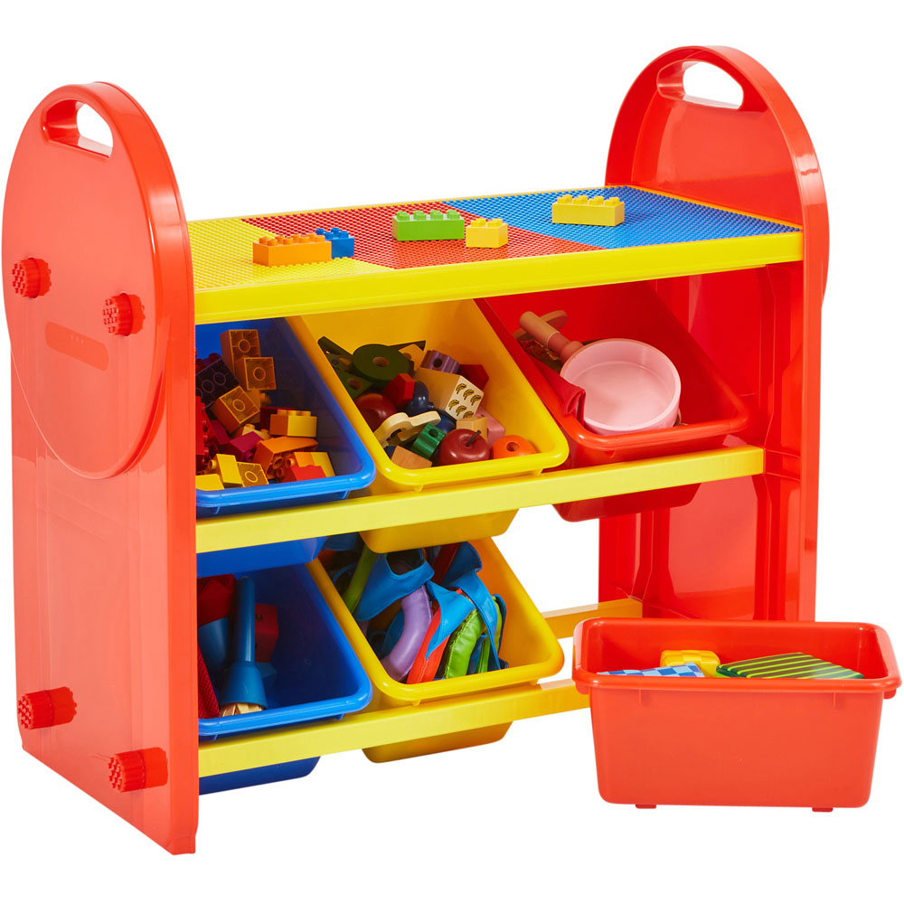 Declutter your kid's room with this Liberty House Toys Kids 6 Bin Toy Organiser Unit. The unit features a construction tabletop and two shelves, each holding three plastic storage boxes. Made from non-toxic, durable plastic, the unit has smooth rounded edges for safety and hand holes for easy transportation. Easily display toys in the boxes at an angle for visibility and easy retrieval, or keep them flat to hold contents out of sight. Compatible with the most popular brick brands, your children can make the most out of their toys. Suitable for ages 2 and above. Storage Organiser Dimensions: H660 x W690 x D360mm, Storage Boxes Dimensions: H130 x W200 x D300mm.