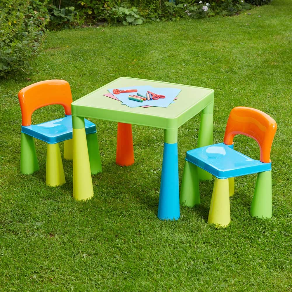Bring fun and creativity to your child's room with this Kids Plastic Table and Chair Set. It's lightweight yet strong and sturdy, making it perfect for use both indoors and outdoors. This set comes with a table and 2 chairs, plus trumpet-shaped legs for extra stability. You can easily put together this multicolour set without any tools. Great first table and chair set for your little one. Table Dimensions: H460 x W510 x D530mm, Chair Dimensions: H460 x W300 x D310mm and Chair Seat Height 260mm.