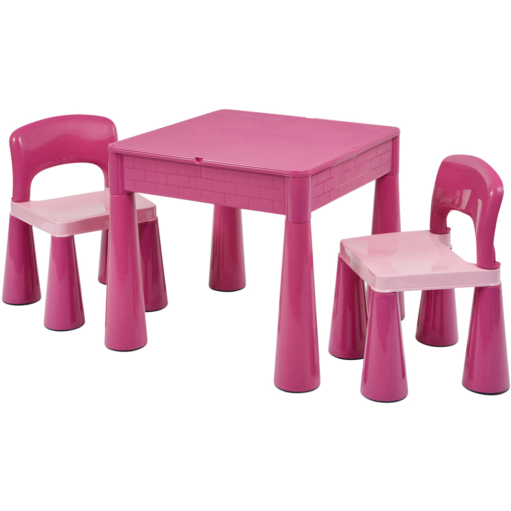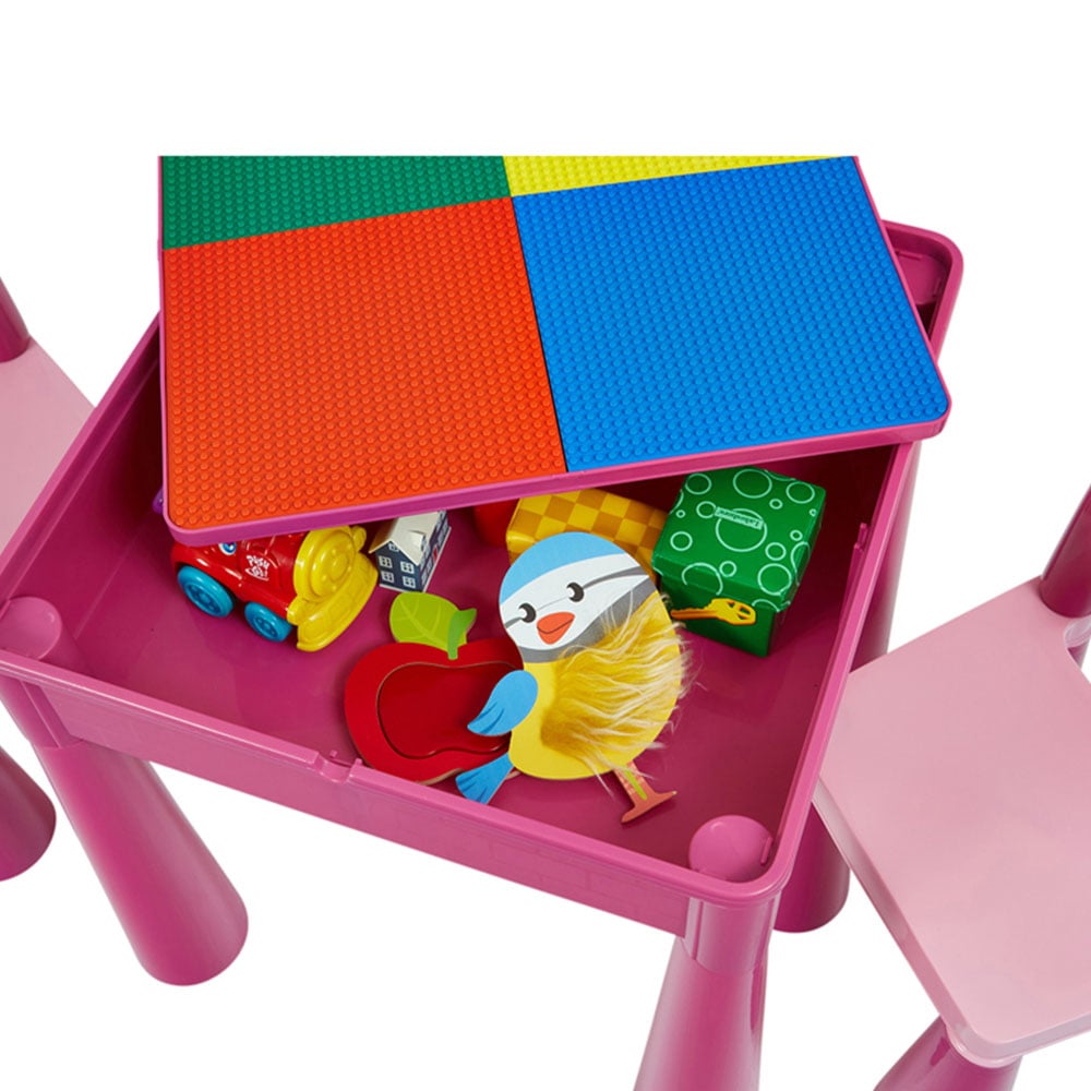 Creativity knows no limits with Liberty House Toys. Watch your children's imaginations fly as they discover numerous opportunities on the reversible tables with this 5-in-1 Activity Table and Chairs Set. This Pink chair table set includes space for writing, dining, playing, and finishing homework. The children age 2 or above can construct and design using their preferred brick brands on the construction side. Its base changes into a sand and water play area, providing hours of sensory enjoyment. It's a parent's paradise with its space-saving features and simple cleanup. Table Dimensions: H465 x W510 x D530mm, Chair Dimensions: H460 x W300 x D310mm and Chair Seat Height is 260mm