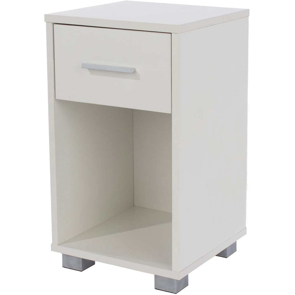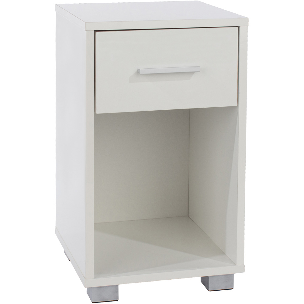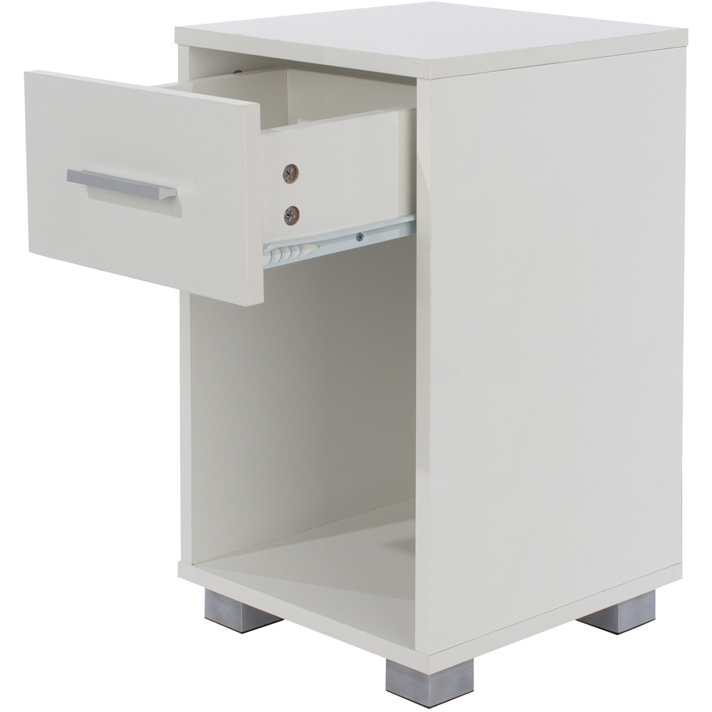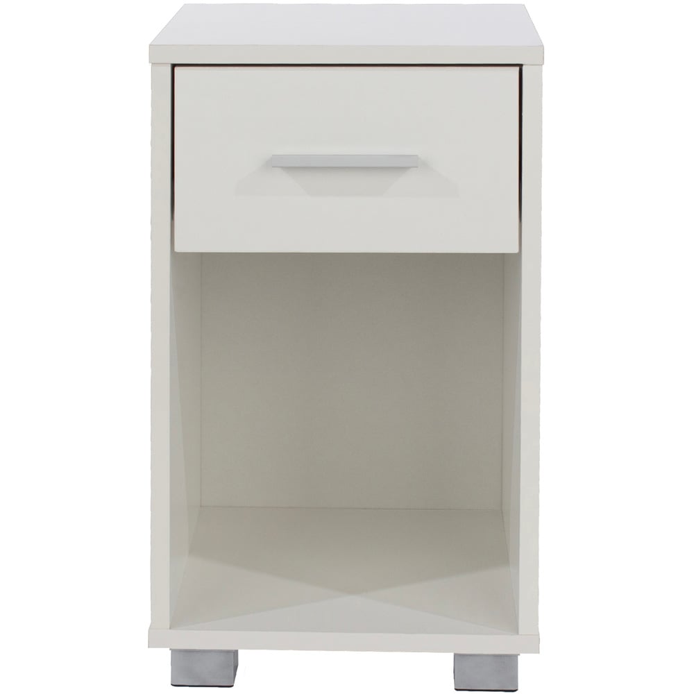 Make way for effortless organisation within arm's reach with this Lido Single Drawer White High Gloss Compact Bedside Cabinet. This compact bedside cabinet with one drawer is ideal when space is at a premium in your home. It features a smooth gloss white film finish, which is both hardwearing and easy to clean. Matt silver effect handles and feet complete the look, whilst the easy glide drawer is ideal for everyday use.
