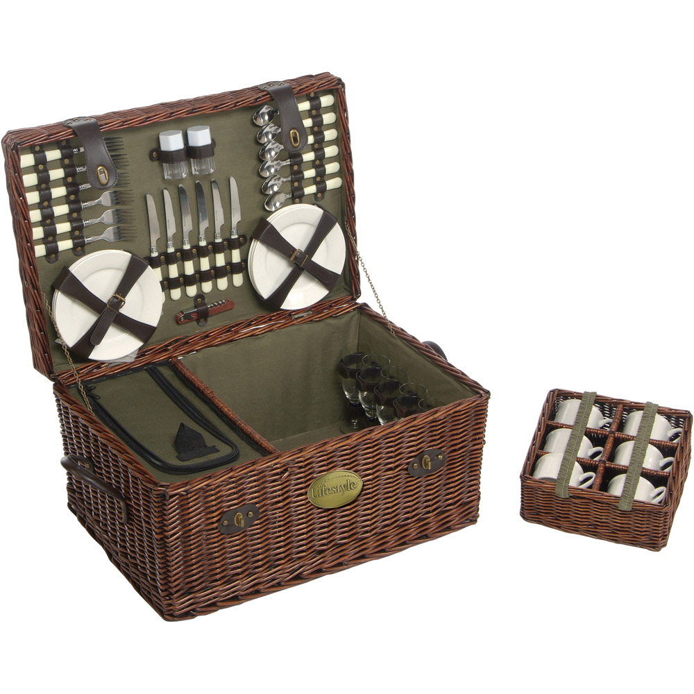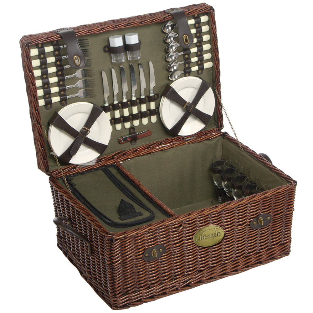 This 6 Person Picnic Hamper from Lifestyle comes complete with a cooling bag, also includes cutlery, plates, wine glasses, corkscrew bottle opener, salt and pepper shakers and six ceramic cups in a protective willow holder. Everything is strapped down and padded where needed. The front buckles and side handle provide secure transportation. This picnic hamper is also a thoughtful and unique gift idea!