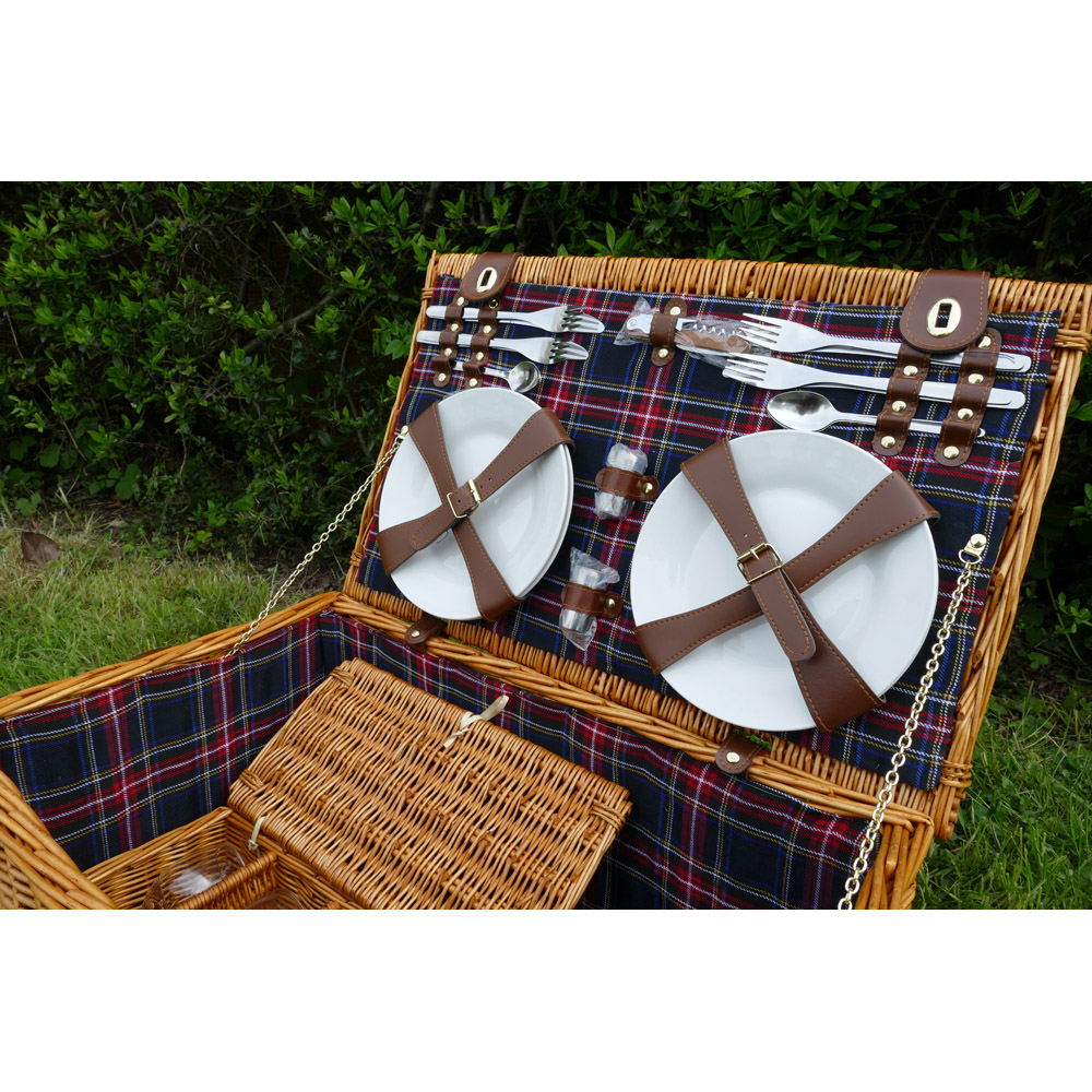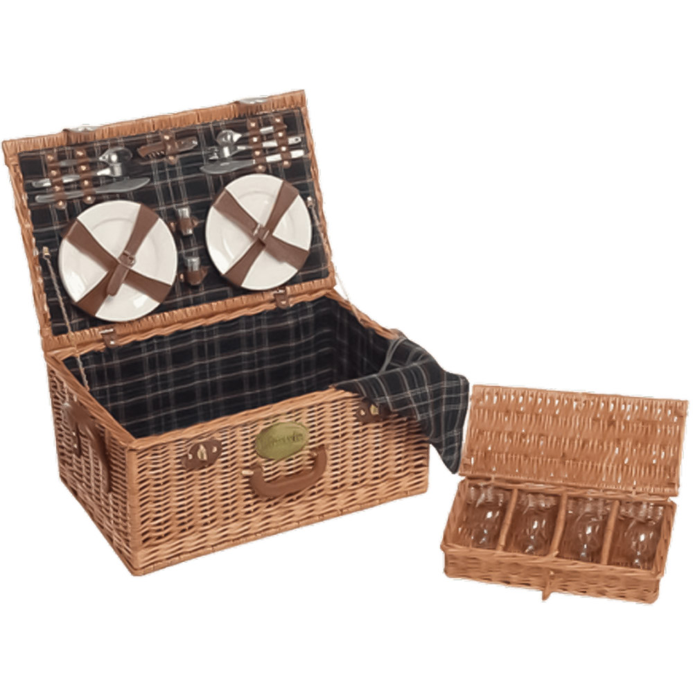 Enjoy your outdoor meals with family and friends with the Lifestyle Paddington Willow Picnic Hamper. This incredible suitcase-shaped wicker basket comes complete with a dining set for four people, including cutlery, plates, bottle opener, salt and pepper shakers, napkins and wine glasses in their wicker holder. You won't have to worry about anything slipping or breaking, as everything is securely strapped down and padded where needed. The front buckles fasten for extra security, and there are handles on the sides and top for easy transportation. This picnic hamper is not just practical, but also a unique and thoughtful gift idea for your loved ones to enjoy.