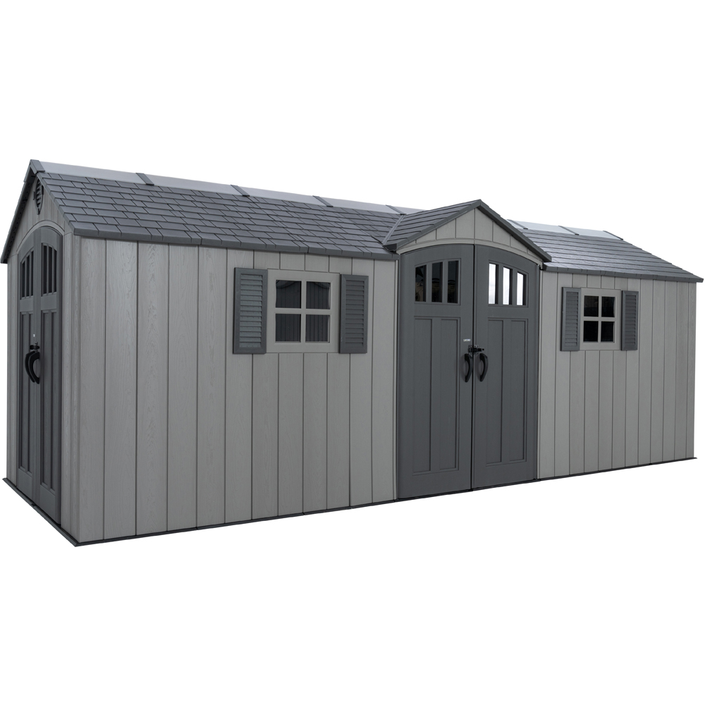 Arrange your yard, store your outdoor items and furniture, and easily hide your lawn and garden tools with the Lifetime Outdoor Storage Shed. Customise your area to your liking with shelving that can be adjusted in height, and benefit from a UV-protected finish that safeguards against weather damage and the elements with minimal upkeep. Six skylights ensure ample natural lighting inside, while the steep roof enables quick drainage of rain and snow. The shed is constructed from steel-reinforced high-density polyethene and features a robust double-wall design for maximum strength and longevity, with heavy-duty steel trusses providing outstanding roof durability. Work assuredly on the slip-resistant flooring that guards against oil, solvents, and stains, and is simple to clean, just like the other parts of the shed. Additionally, your equipment can be secured behind steel-reinforced doors that are lockable. With an appealing design and aesthetic, alongside a distinctive rough cut texture that mimics the natural look and feel of wood without the need for staining or painting, you can appreciate not only the functionality and practicality of your shed but also maintain the beauty of your yard. Whether you're aiming to store some tools or organise your entire collection, the Lifetime Outdoor Storage Shed is equipped with the features to make it simple and visually pleasing.