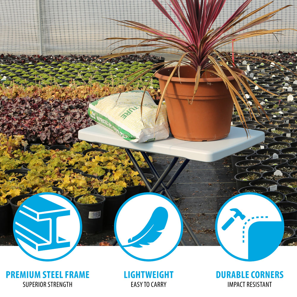 When you need a dependable table that can perform multiple tasks, the Lifetime Personal Table has the versatility to stand up to the occasion. Go anywhere and store it easily using its folding legs and lightweight frame. Whether you need a quick and accessible surface or want a reliable end table or counter extension, this product has the durability to be there for you in almost any scenario without sacrificing quality. Take it outside or into the garage, where the powder-coated and weather-resistant finish will keep it in top shape. Set it up indoors and work or relax in comfort thanks to the ample leg room offered by the wide stance and secure construction. Adjust the height between one of three settings to best suit your needs. For all the ways you love to be productive or have fun, the Lifetime Personal Table is there to assist.