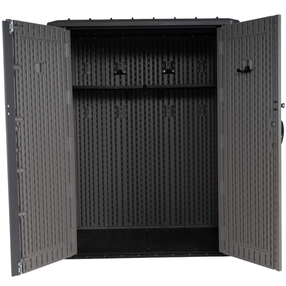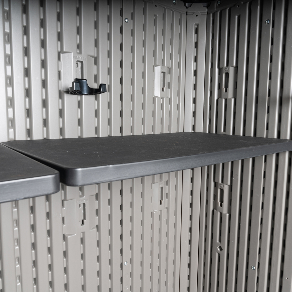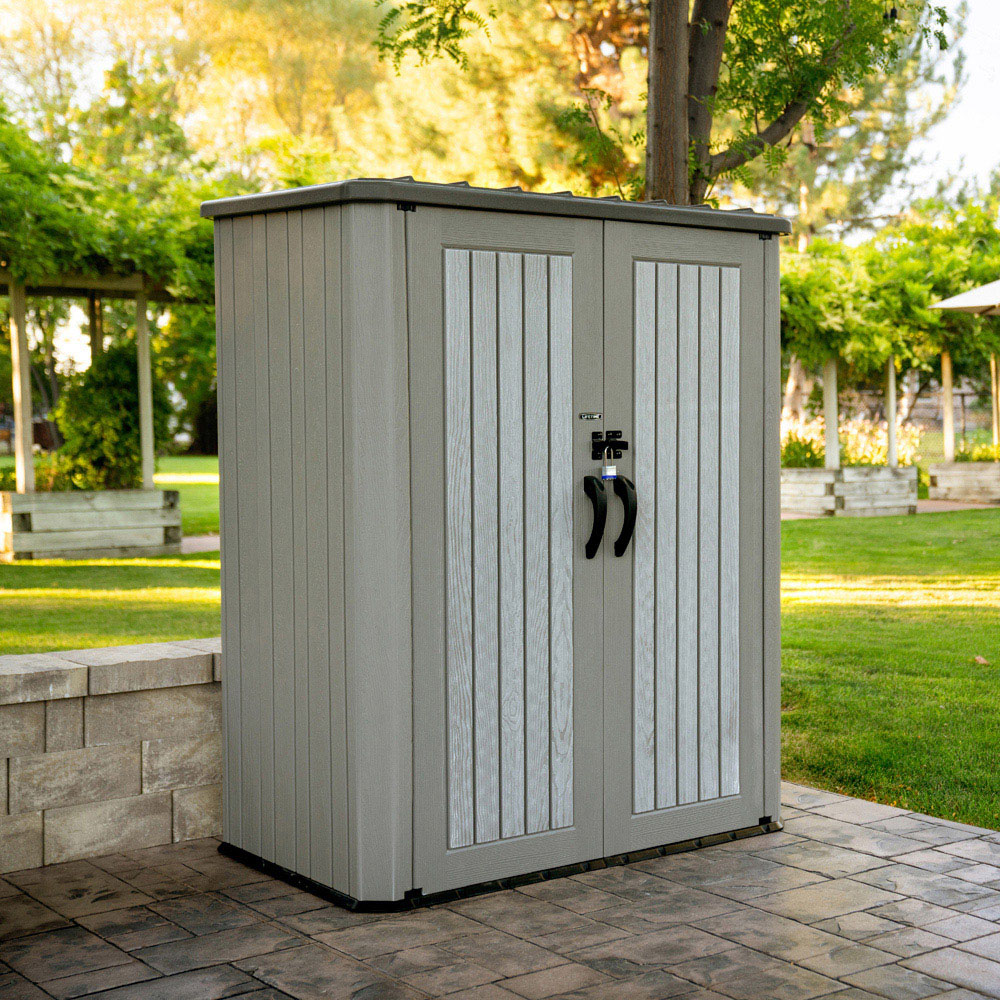Looking for a way to store your lawn and garden gear, but want to make the most of your outdoor space? The Lifetime Compact Utility Shed is a unique and intuitive storage structure that takes up a small amount of space but holds a large amount of tools and equipment. Organize it your way with six wall hooks and configurable shelves for custom arrangement, and keep your goods secure using two deadbolts and a sliding, lockable bar latch. Your shed will stay sturdy and secure thanks to a steel-reinforced frame and dual-wall HDPE construction. You can enjoy the attractive look that features Rough Cut™ wood texture door panels and additional wood grain detailing, so not only will you be able to keep your lawn and garden neat and organized, but you’ll be able to do it in style.
