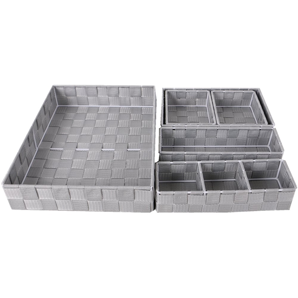 With a variety of different basket sizes included, this Set of Six Woven Baskets Light Grey is perfect for organising your home. Suitable for living rooms, bedrooms, and bathrooms, the contemporary design will add a stylish touch to your household storage.