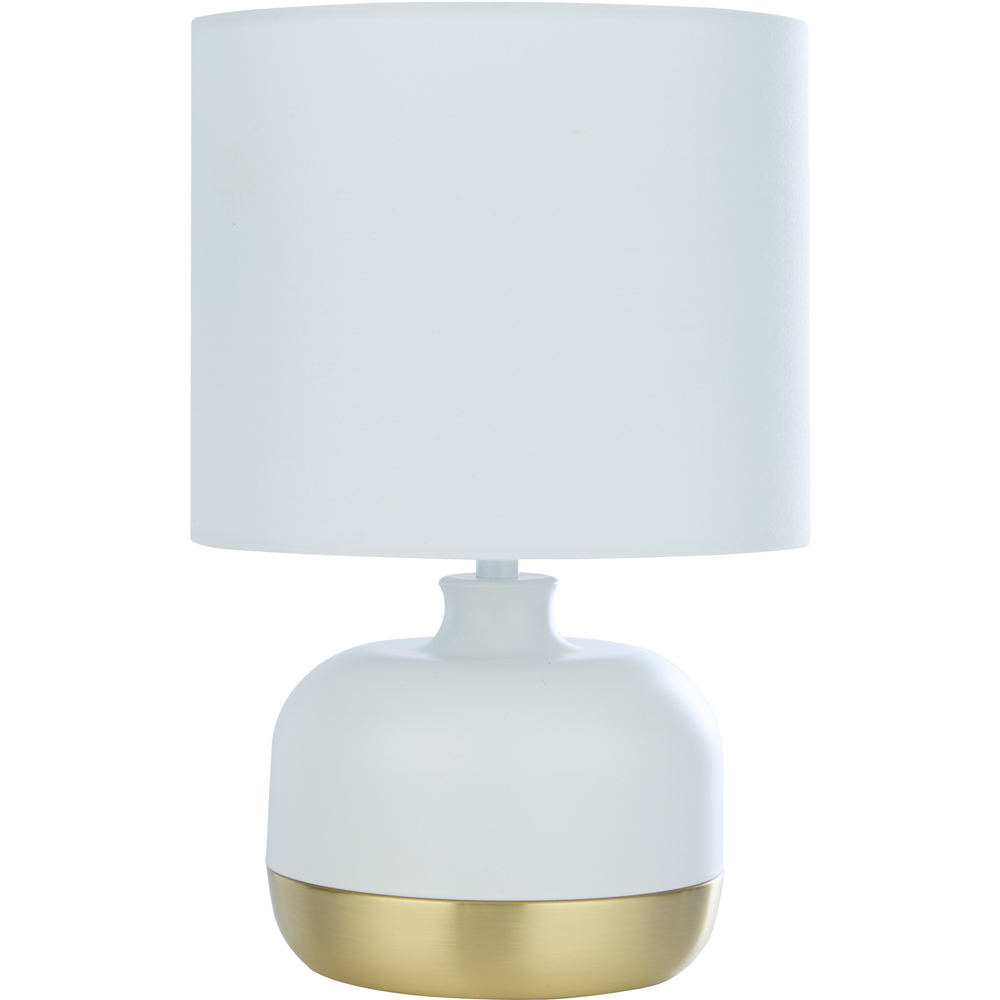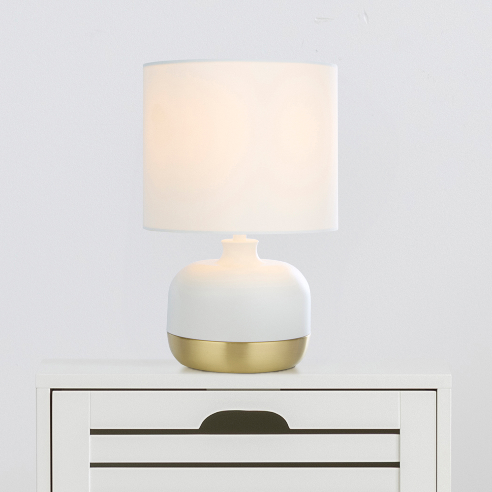 Simple yet sophisticated, this Lighting Collection Ezra White and Gold Touch Lamp with a matte base featuring an elegant gold stripe detailing. The integrated touch dimmer switch allows you to adjust the light to three settings, making it perfect for creating the right mood, whether you’re relaxing or reading. A modern, functional design that blends style with everyday convenience.
