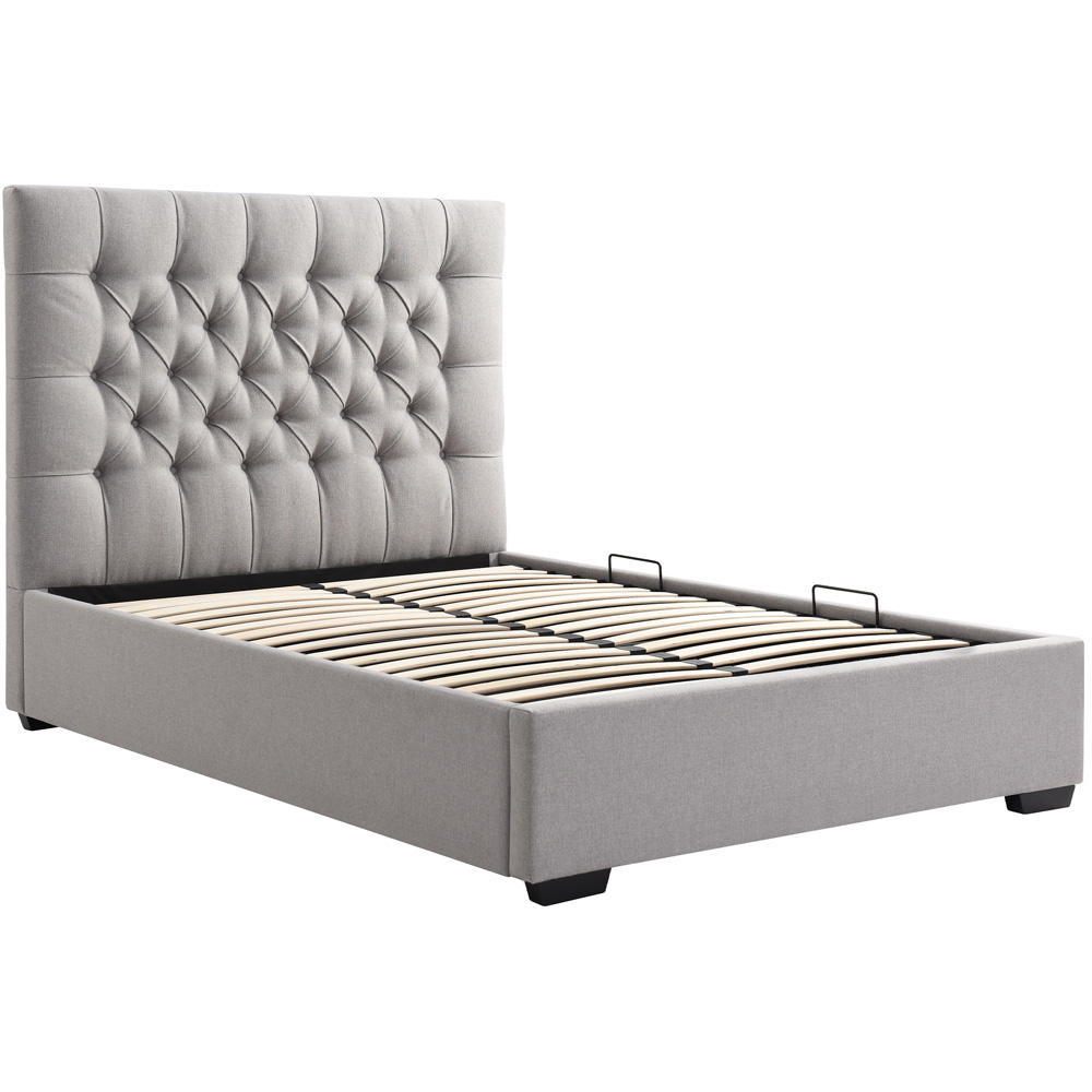 Bring timeless design and modern functionality to your bedroom with the Lila King Grey Faux Wool Ottoman Bed. This chic ottoman bed frame features spacious under-bed storage and is wrapped in a luxurious faux wool grey fabric. The modern buttoned headboard design and sleek black wooden feet make for a timeless addition to any bedroom. This multilift ottoman bed can be lifted from the side or the end, and the slatted base ensures maximum comfort and stability, promising a restful night's sleep.