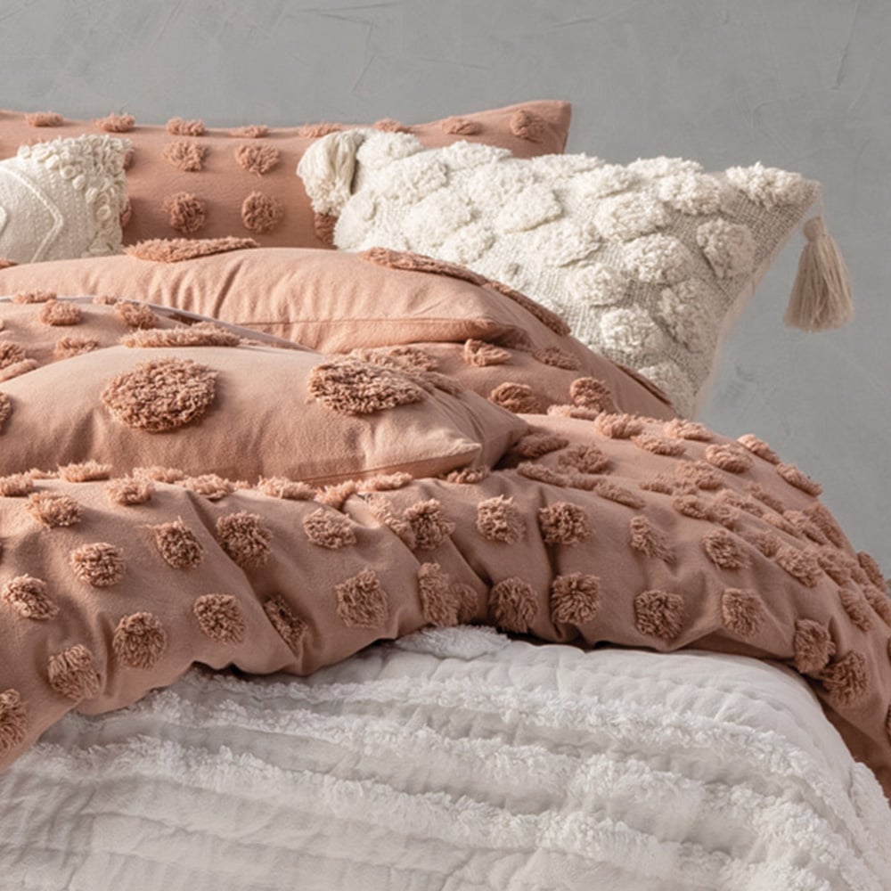 Add a charming touch to your bedroom decor with the Linen House Haze Double Cream Tufted Duvet Cover Set. This duvet cover set features a beautiful, tufted cotton polka-dot design. This set is crafted using soft and tactile, tufted cotton chenille fabric with marvellous vintage appeal. This cosy set includes matching pillowcases with snap press stud closures. This duvet cover set exudes a calming look and effortlessly complements all types of interior spaces.