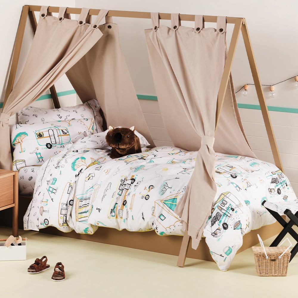 Make an attractive addition to your young one’s bedroom decor with the Linen House Kids Double Down by the River Duvet Cover Set. It features beautiful Australian wildlife, all hand-drawn and printed on white cotton percale ground. It is trimmed with fluorescent-yellow cord piping and reverses to a black-and-white print of fishing rods, cricket bats, flashlights and more go-to essentials. This cosy duvet cover set includes matching pillowcases with clear button closures. This duvet set is crafted using 100% cotton fabric for ultimate comfort. This duvet cover set exudes a playful look and effortlessly complements all types of interior spaces.