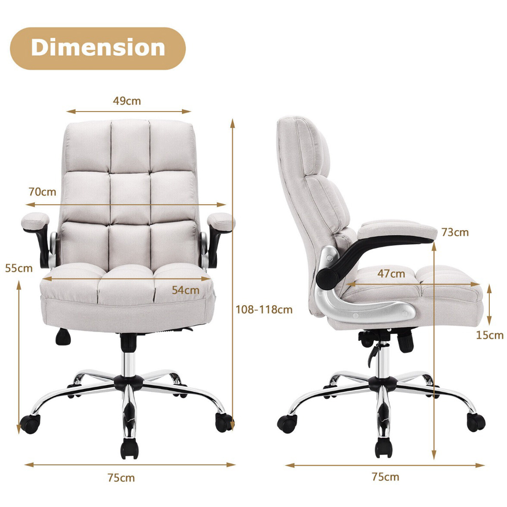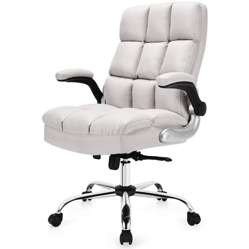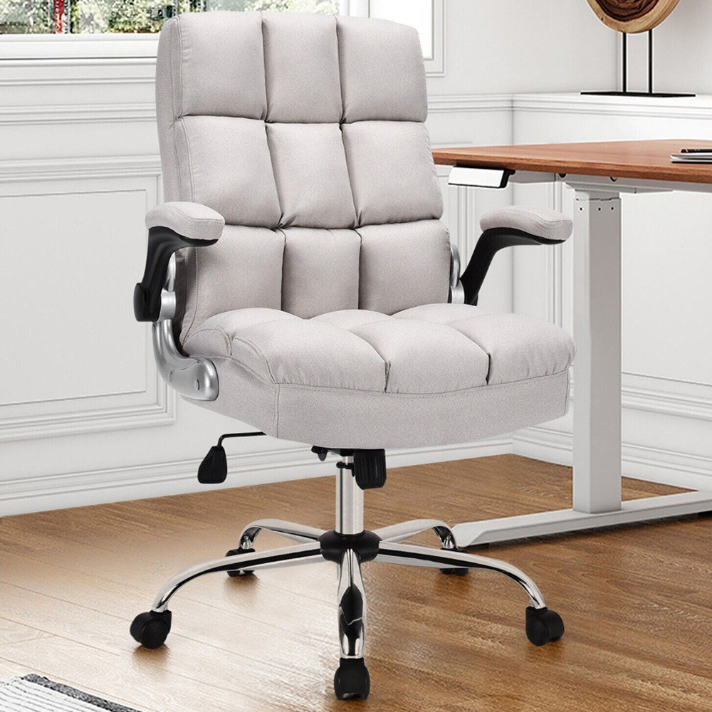 Elevate your workspace comfort with the Costway Beige Linen Upholstered Adjustable Ergonomic Office Chair. It is designed to blend ergonomic support with aesthetic appeal in a beige hue. This chair offers a tilting high backrest and an adjustable seat height, ensuring a perfect fit for your body and preferred posture. The high-density sponge in the seat cushion provides a plush, comfortable feel, while the breathable linen upholstery ensures durability and ease of maintenance. Smooth-rolling casters and a sturdy metal 5-claw base support up to 135kg, making it a reliable choice for any home office environment. Whether it's for intense work sessions or prolonged meetings, this executive chair is crafted to enhance both productivity and comfort.