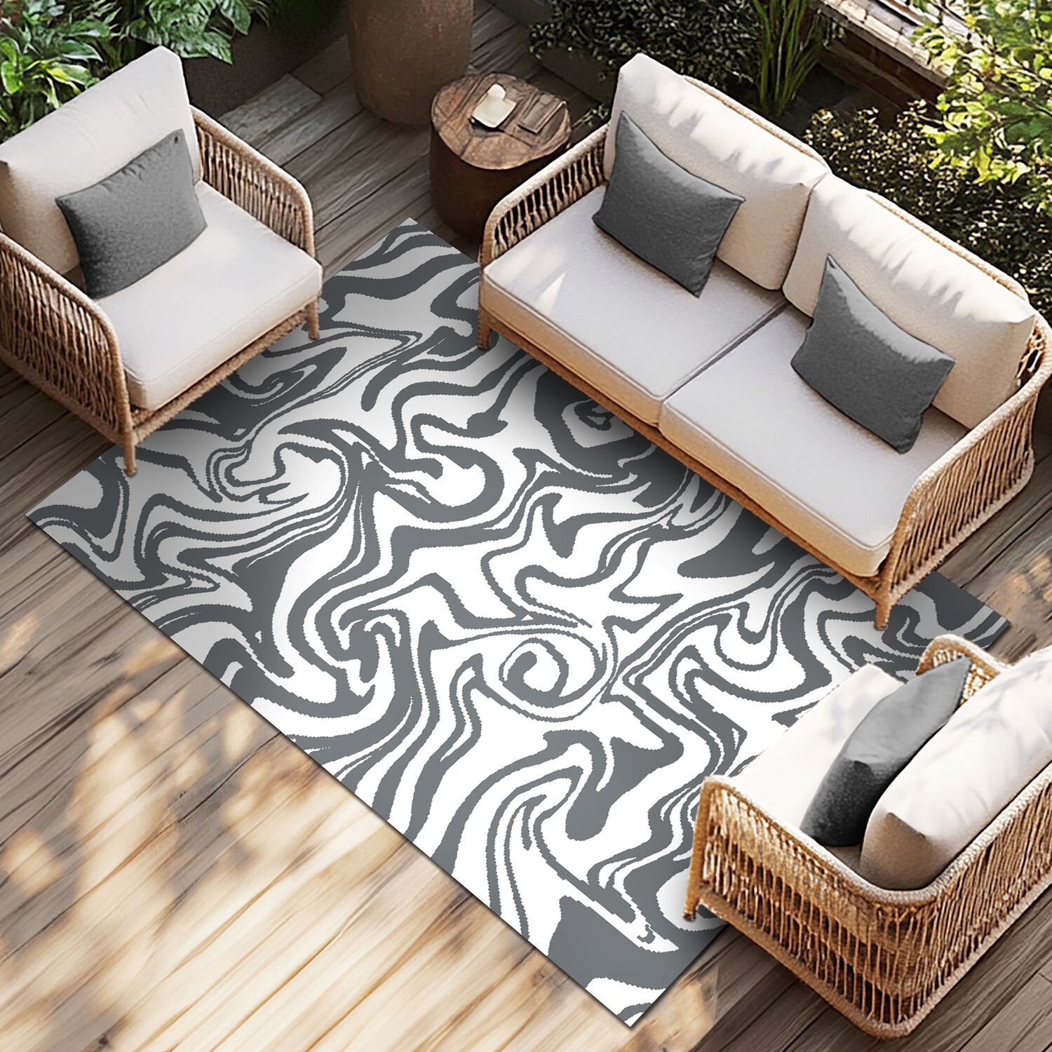 Elevate your space with the Liquid Marble Reversible Outdoor Rug. Featuring a marbled design, this rug is crafted from weather-resistant materials, offering durability and elegance for outdoor spaces. Made from recycled plastic, it is UV-resistant, mould-resistant, and stain-resistant, ensuring long-lasting beauty. This rug doesn’t retain water or odours, making it perfect for patios, balconies, and gardens. It is easy to clean; simply shake it off, hose it down, or wipe it with mild soap and water. It is a practical and pet-friendly choice for any alfresco setting.