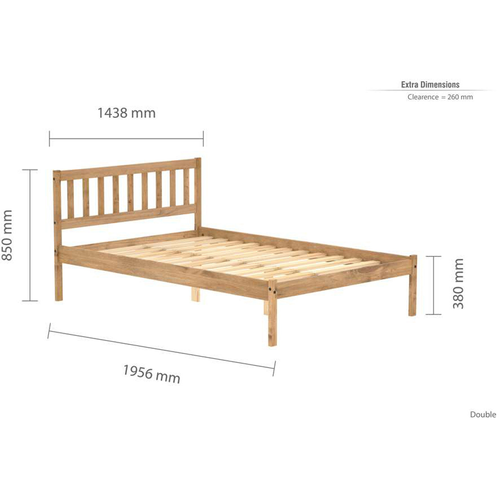 With a traditional pine bed frame, this Lisbon Double Bed by can be a great addition to any bedroom setting. This Lisbon double-size bed is waxed to give a desirable rustic feel accompanied by a solid slatted base for firmer support, allowing air to circulate beneath the mattress. Also, it is only suitable for a UK standard-size mattress. With its simple and classic design, it can be the ideal option to add to your bedroom.