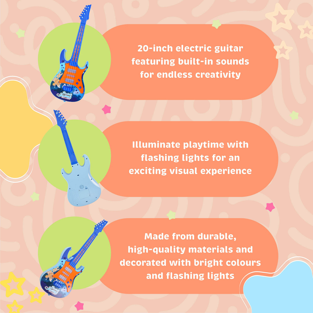 Let your little ones embrace their inner Rockstar with this vibrant and entertaining Little Star Fun Rock Guitar. This toy guitar is designed for pure fun with a variety of built-in sounds, rhythms and light effects that encourage children to dance and perform. Complete with an adjustable strap, its colourful design and easy-to-use buttons make it an appealing choice for young aspiring musicians. This 20-inch electric guitar is perfect for imaginative play, helping to develop a love for music and performance from a young age. Made from high-quality materials, it's lightweight, durable, and sized just right for little hands, making it an ideal gift for children who dream of taking the stage. Requires three AA batteries (not included). Dimensions: 57 × 19cm. Weight: 300g.