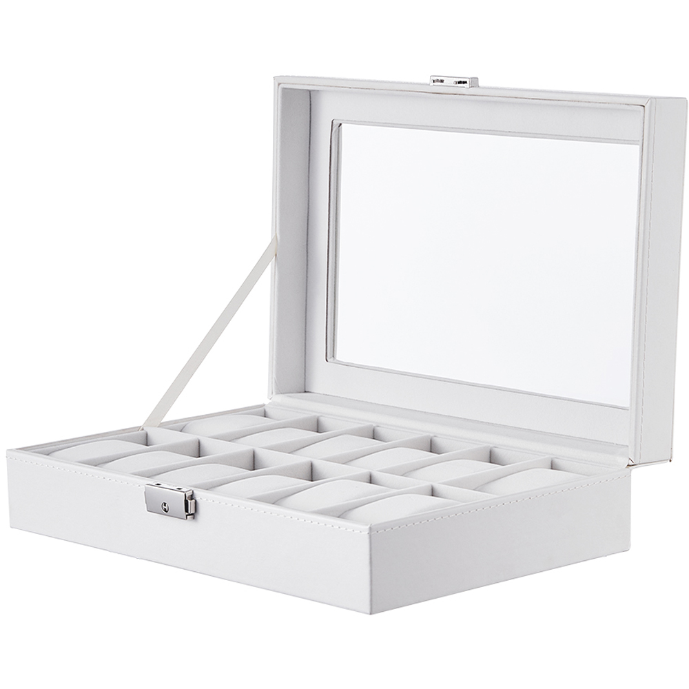 Living and Home 12 Slot White Faux Leather Watch Display Box with Glass Lid