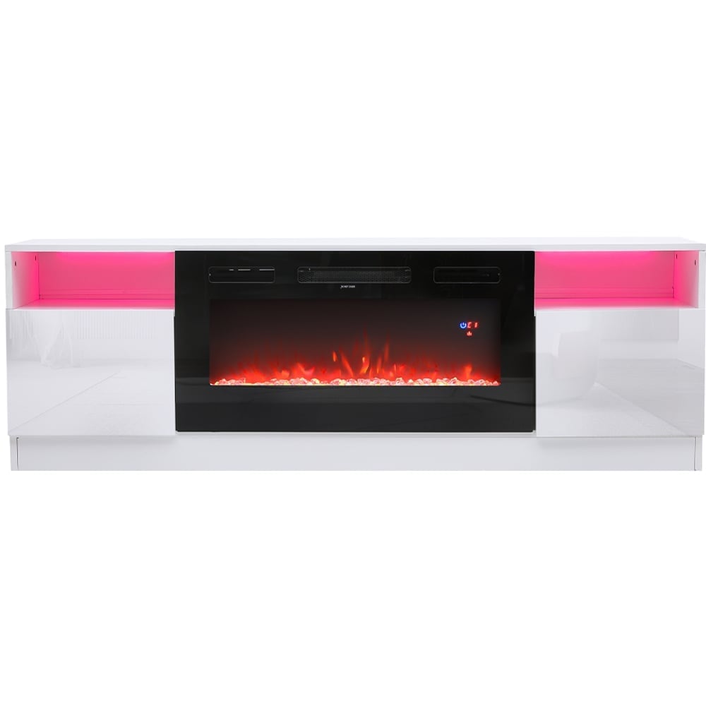 Living and Home Fireplace TV Stand seamlessly combines warmth and sophisticated storage in one beautifully crafted unit, maximising floor space with its console-integrated electric fireplace that delivers a realistic, eco-friendly flame without wood or gas hassles. Customise your ambience year-round with 12-colour background lighting, 3 adjustable flame colours, and five brightness levels, while enjoying efficient heating optimised for 400 sq ft spaces (temperature adjustable from 62°F/16.5°C to 82°F/28°C) or using the flames independently without heat. The modern TV stand features versatile closed and open storage compartments for organised media devices, DVDs, and book display, enhanced by crystal stone or log embellishments. User convenience includes a remote control, 1-8 hour timer with auto shut-off, digital thermostat, and critical UK safety compliance through thermal cut-off and overheat protection. (Tip: This item requires assembly; the 2 packages may arrive in separate deliveries – check you have all parts before starting)
