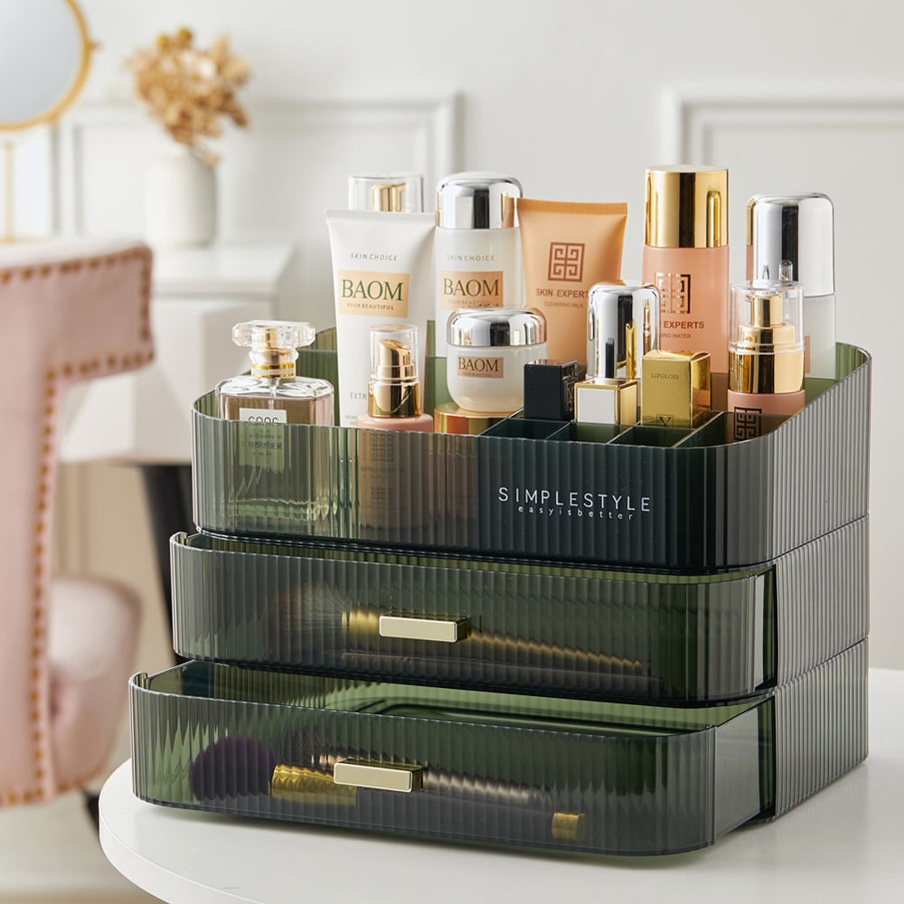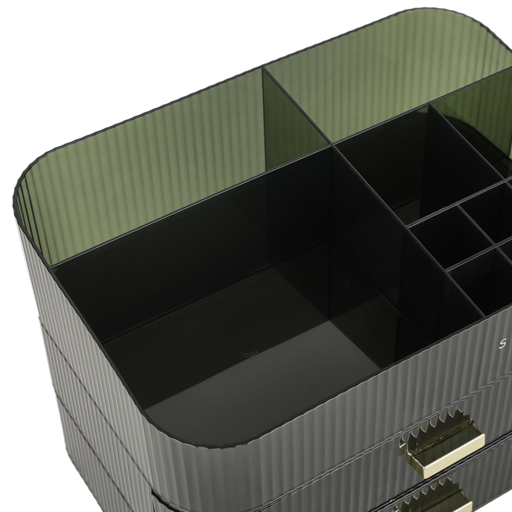 This cosmetic organiser is designed to keep your cosmetics organised, protected from dust and easily accessible. With a thoughtful combination of open and closed storage spaces, this organiser allows you to neatly arrange skin care products, cosmetics, and assorted accessories on your desktop. The spacious open area on the top accommodates items of varying heights, while the compartments ensure the separation of different products for a tidy appearance. The two drawers effortlessly slide in and out, providing secure sealing to safeguard the quality of your cosmetics.