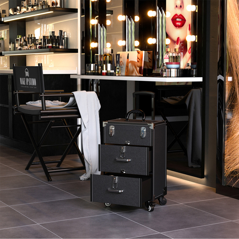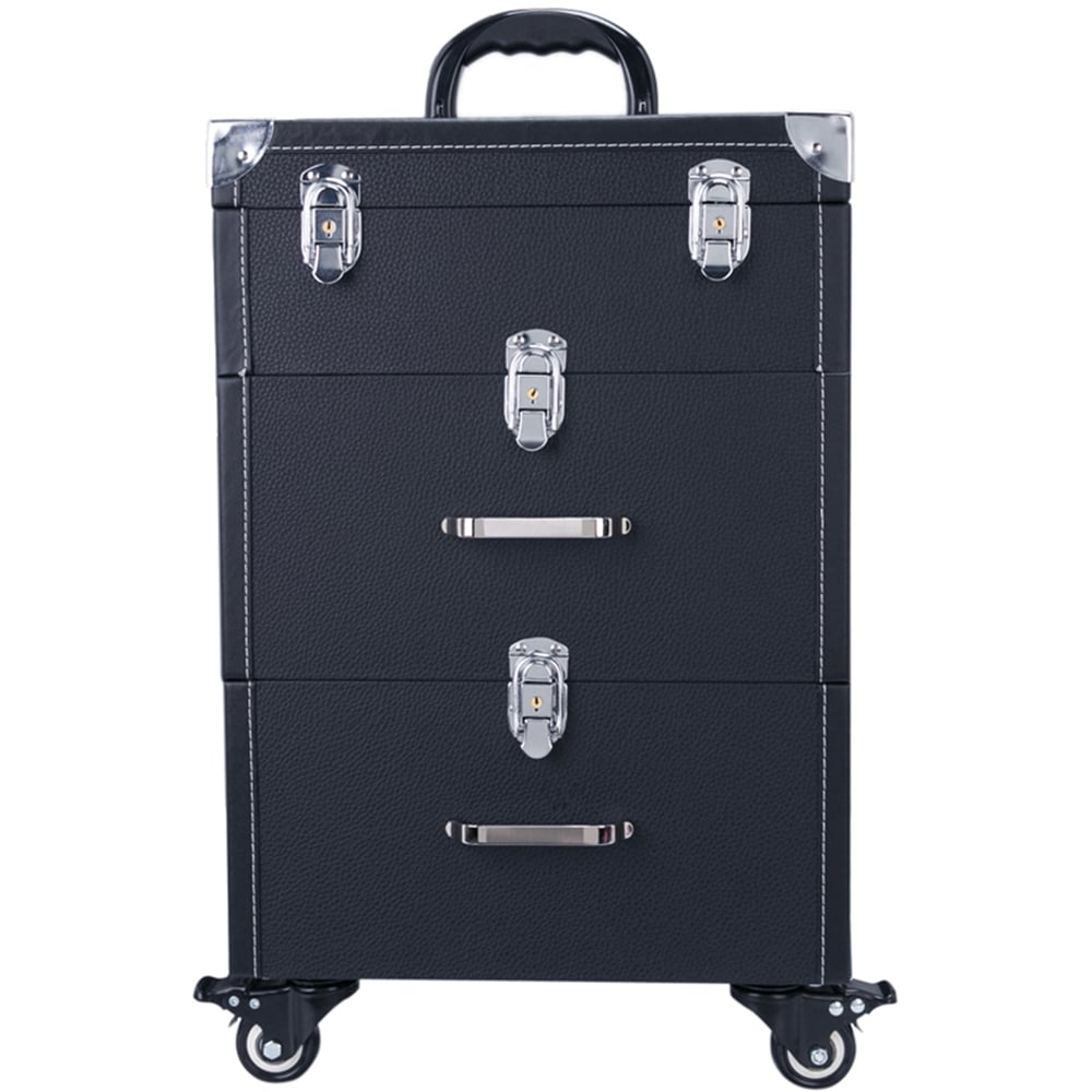 This vanity case is ideal for keeping your makeup organised on your travel. It is equipped with an adjustable telescopic handle, and when you do not need to move the case, you can fully retract it and keep it out of sight at the back of the case to make it a makeup station. There are two large drawers, one spacious top compartment with slots and a transparent bag under the lid, making it capable of holding all your professional makeup. The fashionable and classic profile enhances the texture of the entire vanity case, making it a nice gift option.