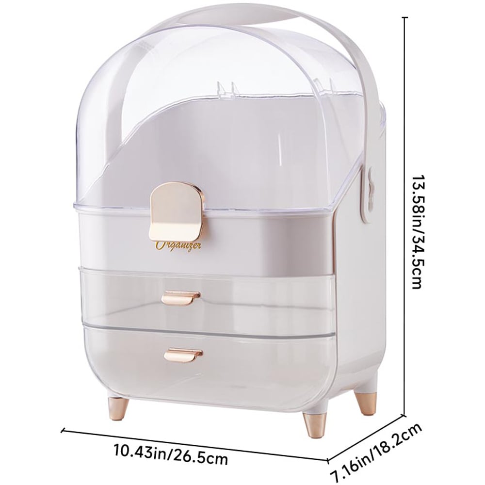 Organize your growing collection of makeup and skincare products with this large-capacity makeup organizer. Designed with a spacious top compartment for various skincare products and two drawers for smaller items, this organizer helps free up your tabletop space. The fully enclosed design keeps your products protected from dust and oxidation, extending their lifespan and ensuring they stay in top condition.