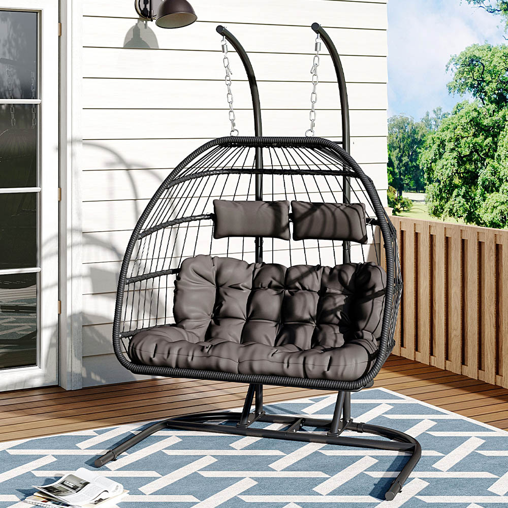 Indulge in outdoor relaxation with this exquisite Hanging 2-seater Chair, perfect for you and a loved one to unwind in nature. Crafted from rust-resistant powder-coated steel, the egg-shaped frame ensures durability against daily wear. Spacious seating, accompanied by plush cushions, guarantees comfort and support. Whether you’re basking in the sun or snuggling beneath blankets in the evening, this chair is your ideal companion for cosy outdoor moments.