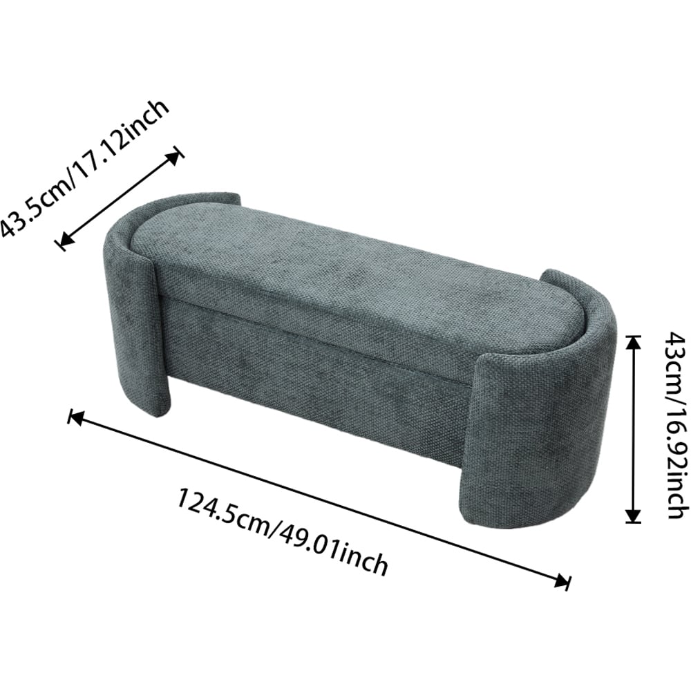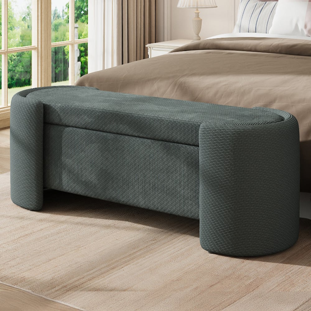 This oval-shaped storage bench boasts a stylish design, featuring dark green fabric upholstery that elevates the aesthetic and sophistication of your space. Cleverly designed, the seat lifts effortlessly to reveal a hidden storage compartment, combining both comfortable seating and practical storage. Perfect for the foot of your bed or entryway, this bench complements modern and minimalist interiors with its refined look and functional design.