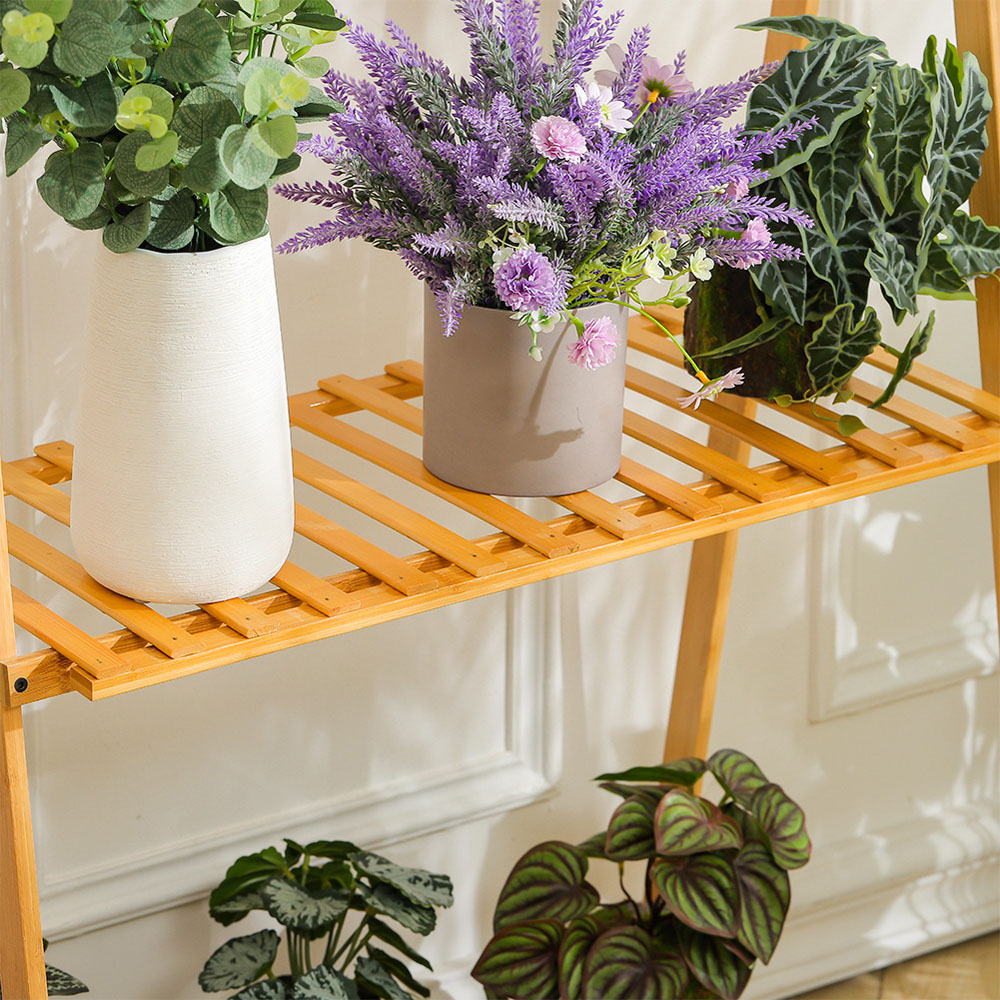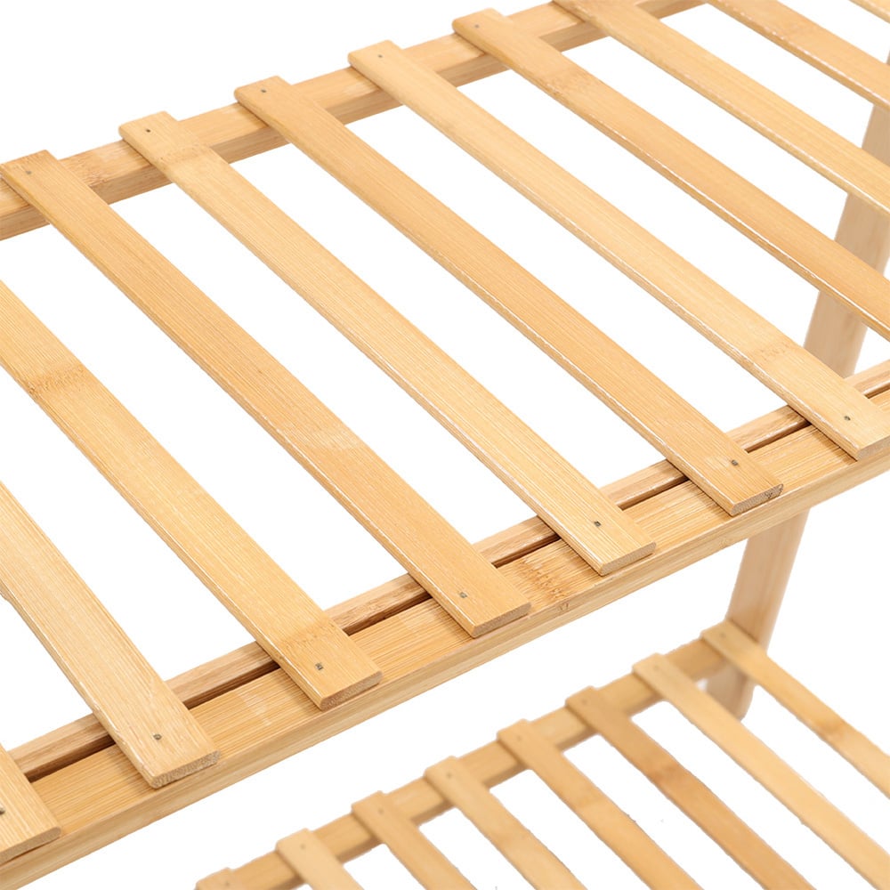 Display your beloved plants in style with this elegant bamboo plant stand, complete with a sturdy hanging rod for a special touch. Whether placed on your patio, balcony, or indoors, this stand offers a perfect combination of practicality and charm. Its hollowed shelves allow for optimal ventilation and water drainage, while the hanging rod lets you showcase a cascading plant for added flair. Plus, the foldable design makes storage a breeze when not in use.