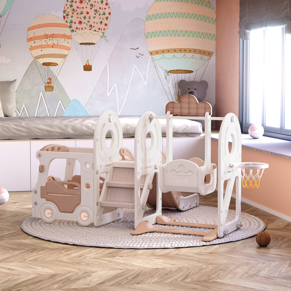 Make your young ones familiar with the Living and Home 3 in 1 Kids Swing and Slide Playset. With its cheerful bus-shaped design, this set invites endless joy with a swing, slide, climbing ladder, and basketball hoop. Crafted from premium materials, it ensures years of spirited play. The T-bar swing boasts a protective shield, the slide features raised edges, and the ladder offers sturdy, easy-to-grasp handles. Unleash boundless fun while nurturing your child's imagination and motor skills.