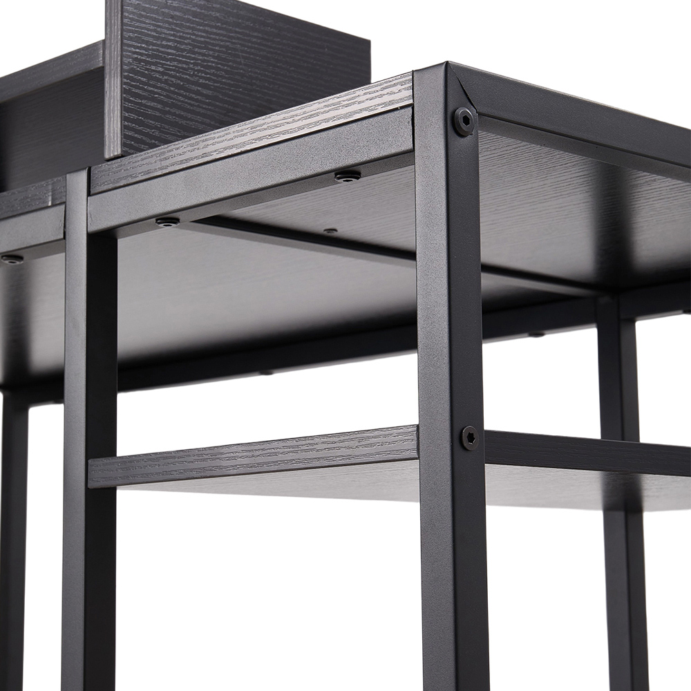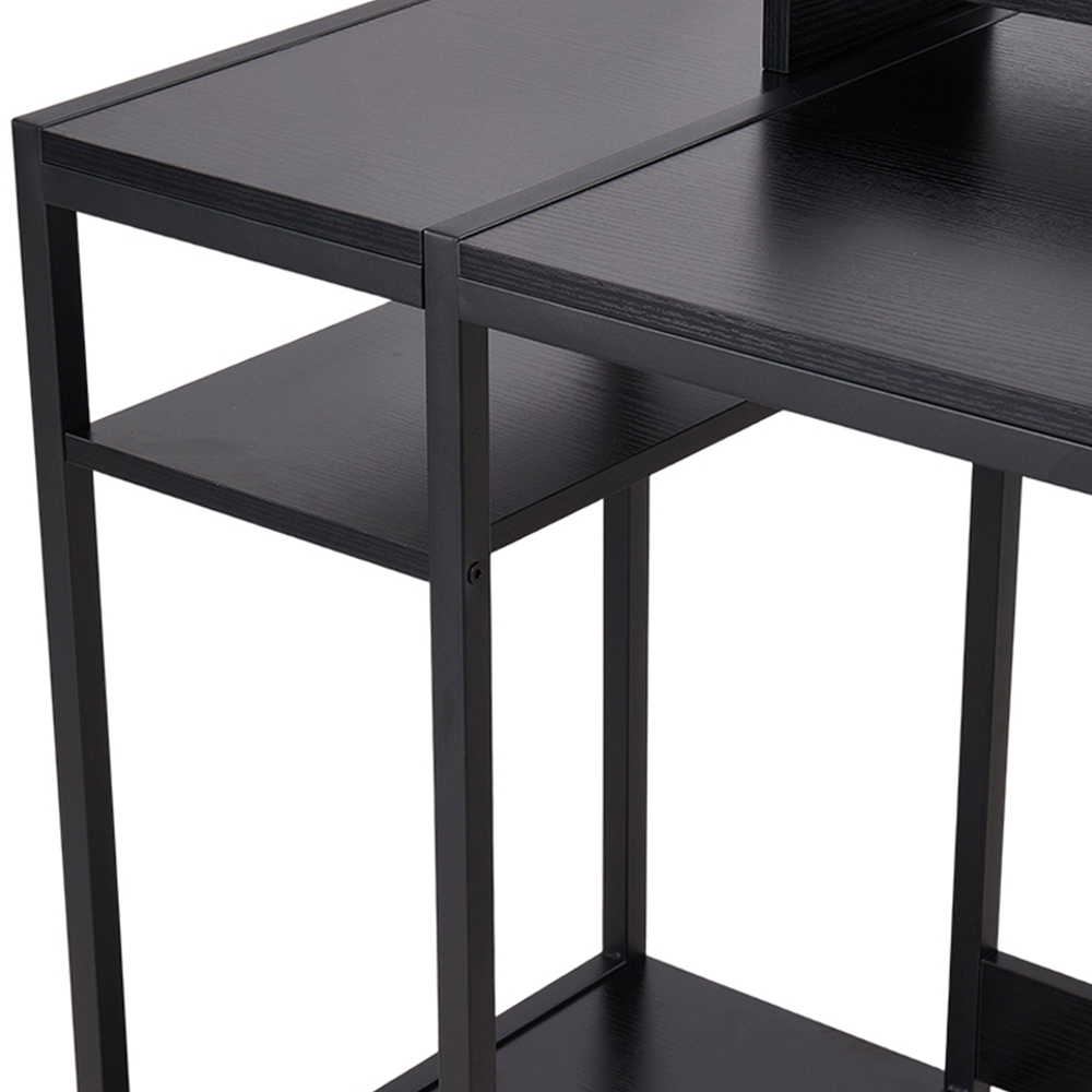 Elevate productivity and comfort with a contemporary workstation desk that brings together a monitor stand, three-tier storage shelf and sleek black finish, making it a superb fit for any home or professional office. Crafted from durable density board and a sturdy metal frame, it features a powder-coated surface that resists scratches and keeps its colour looking fresh. Enjoy a dedicated workspace on the right, complete with a raised monitor shelf to help reduce neck strain, while the left side’s three-tier shelves keep essentials neatly organised. Rounded edges offer added safety and a modern touch, while adjustable feet and a fixed support bar ensure stability and strength for daily use.